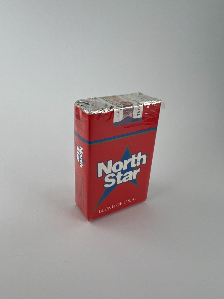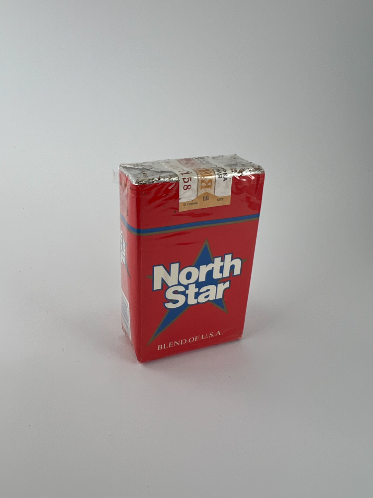 North Star is an American-style blend, but produced for the Russian market. The package is bright red with a blue star and a white „North Star“ logo. The package says „Blend of USA“, but the excise stamp (1B, Russian) and inscriptions indicate that this is a product intended for the Russian domestic market. The simple, bright design creates associations with Western products, but this is a post-Soviet production, rare in modern trade.
