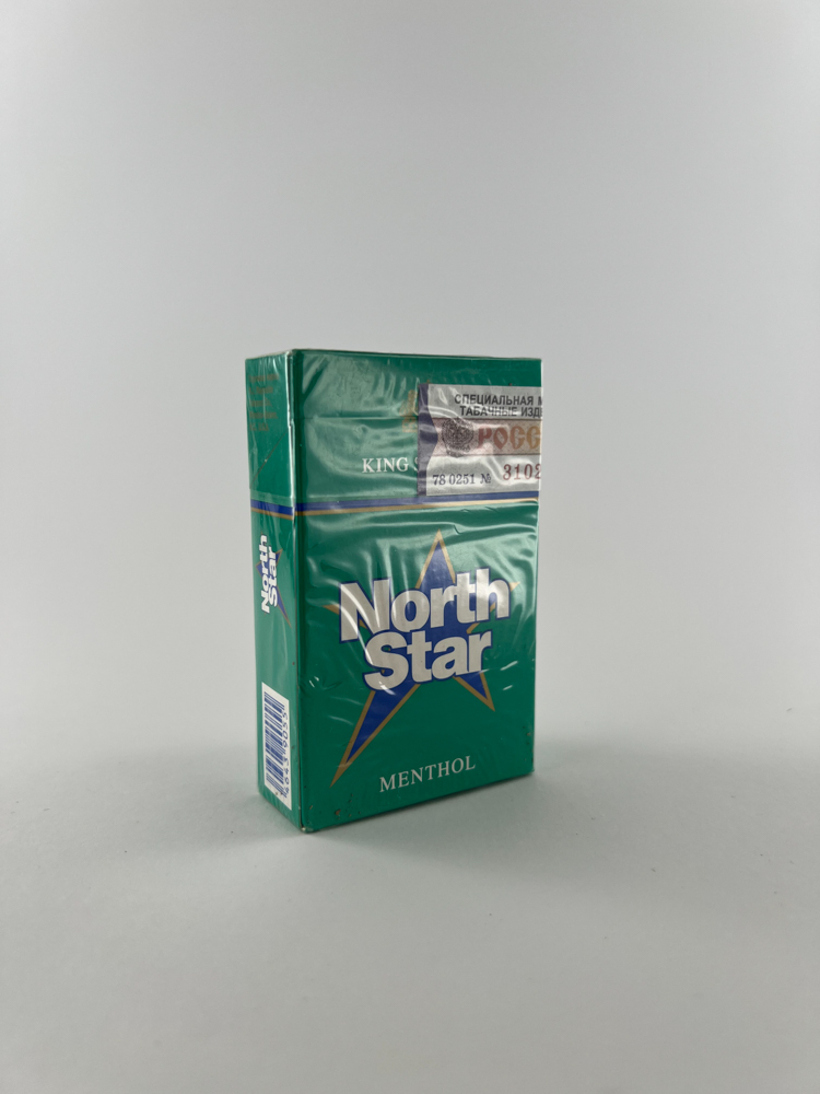 „North Star Menthol“ is a Russian-made cigarette brand aimed at the budget segment. The pack is green, bright, with a large silver logo in the center – the name „North Star“ and a stylized five-pointed star emphasizing the idea of the name. The „King Size Box“ type is indicated at the top, and „Menthol“ at the bottom, clearly distinguishing the menthol flavor variant. This pack is intended for the local market, as evidenced by the Russian excise stamp.