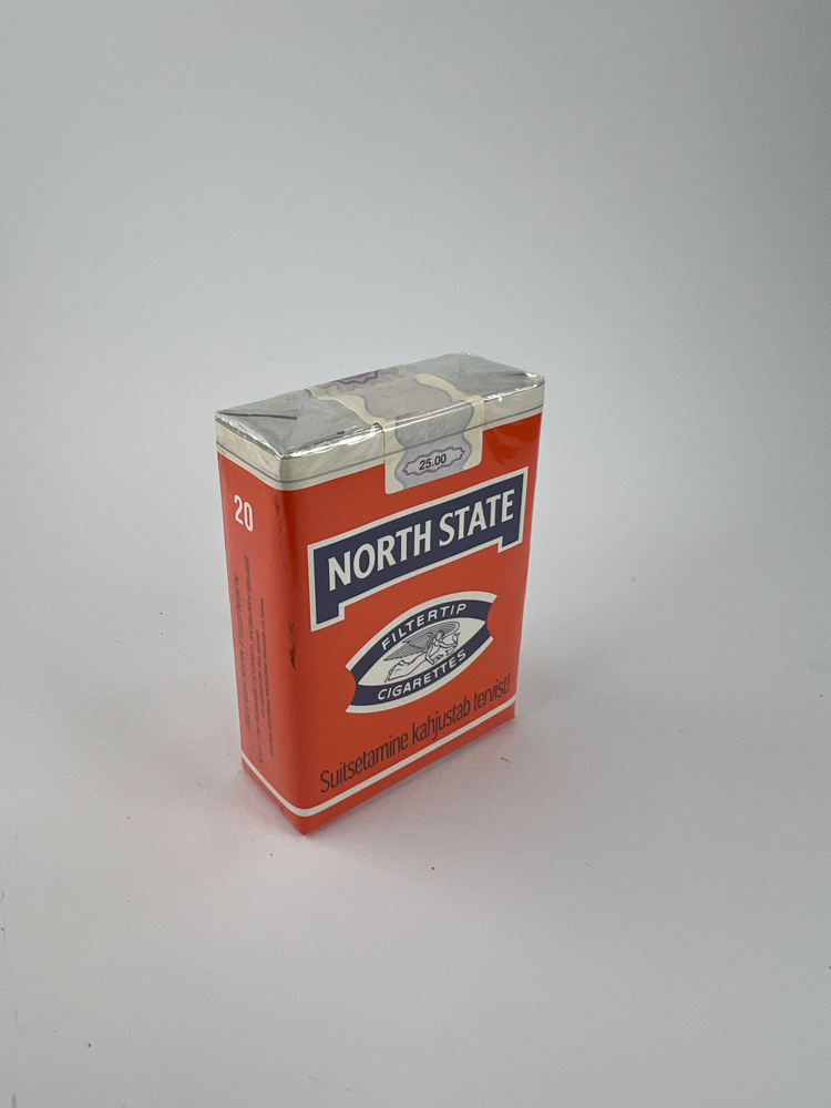 Description: „A pack of North State cigarettes is bright red with a blue logo and white lettering. The front of the pack features a classic white horse-drawn carriage with the words "Filtertip Cigarettes". At the bottom is a warning in Estonian "Suitsetamine säättäb tervist" ("Smoking is harmful to health"), indicating the locality of this release for the Estonian market. At the top are tax stickers with the denomination "25.00", confirming official sale. The pack is unopened and protected by its original film.