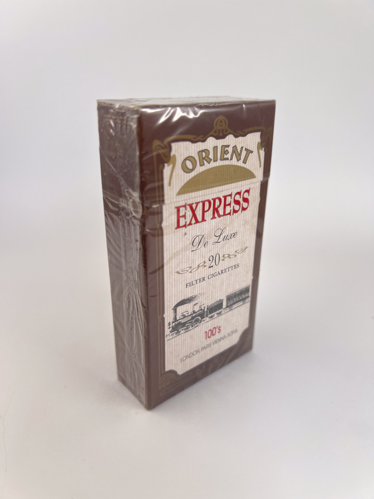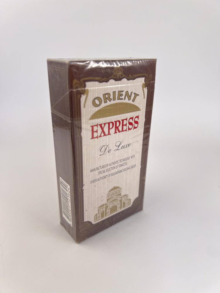 A sophisticated, light brown package with a vertical textured texture and a nostalgic retro design. The inscription on the top ORIENT in a golden arch, and beneath it – a bright, red EXPRESS inscription. Below in elegant font is added Deluxe, giving the packaging a classic luxury feel. The bottom part depicts an antique steam locomotive, symbolizing the famous Orient Express train, and next to it are the indicated city stops – London, Paris, Vienna, Sofia, which clearly links the brand to European themes of travel and aristocratic culture. The reverse side features the outline of a building – presumably the Alexander Nevsky Cathedral in Sofia – and the inscription stating that it is manufactured „under authority of Bulgartabac Holding Group“. The design is a thoughtful balance between ancient elegance and modern tobacco aesthetics.
