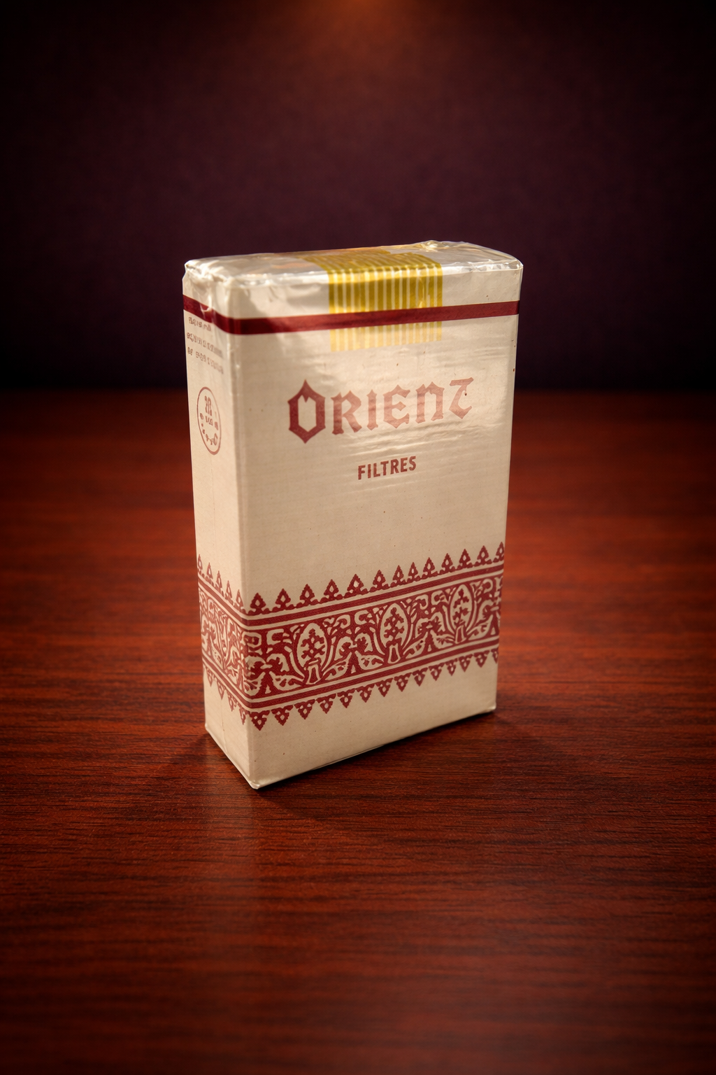 This pack of Orient Filtres cigarettes has an authentic oriental style. The design is a white background with a red-brown decorative pattern reminiscent of traditional Arabic textiles or architectural ornaments. On one side, the name is presented in Latin characters (in French), on the other - in Arabic (الشرق). This indicates that the product was intended for both the domestic and export markets (especially French-speaking countries in North Africa). The pack does not have modern health warnings, and the design is extremely minimalist.