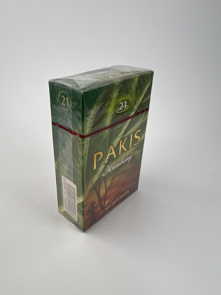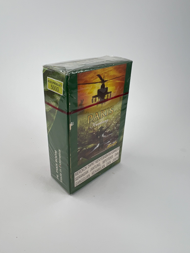 Description: Pakis Kembang cigarečių pakelis išsiskiria sodriu žaliu dizainu su augalų ir gamtos motyvais. Ant priekinės pusės pavaizduota moteris su skėčiu medžių fone, o galinėje pusėje – sraigtasparnis virš kraštovaizdžio. Vizualiai pakelis sukuria natūralumo ir tropinės dvasios įspūdį. Šriftas ir spalvos derinamos taip, kad būtų pabrėžtas gamtos įkvėptas įvaizdis. Įspėjimas apie rūkymo žalą pateikiamas indoneziečių kalba.