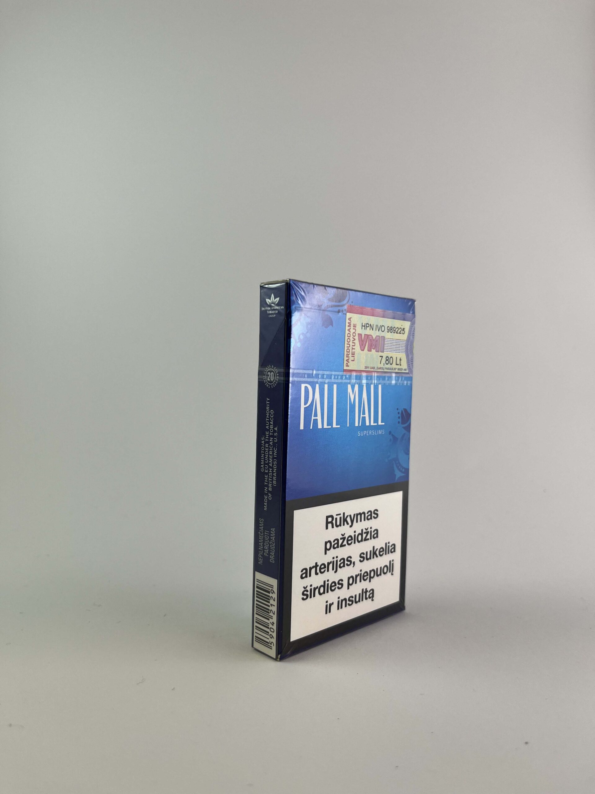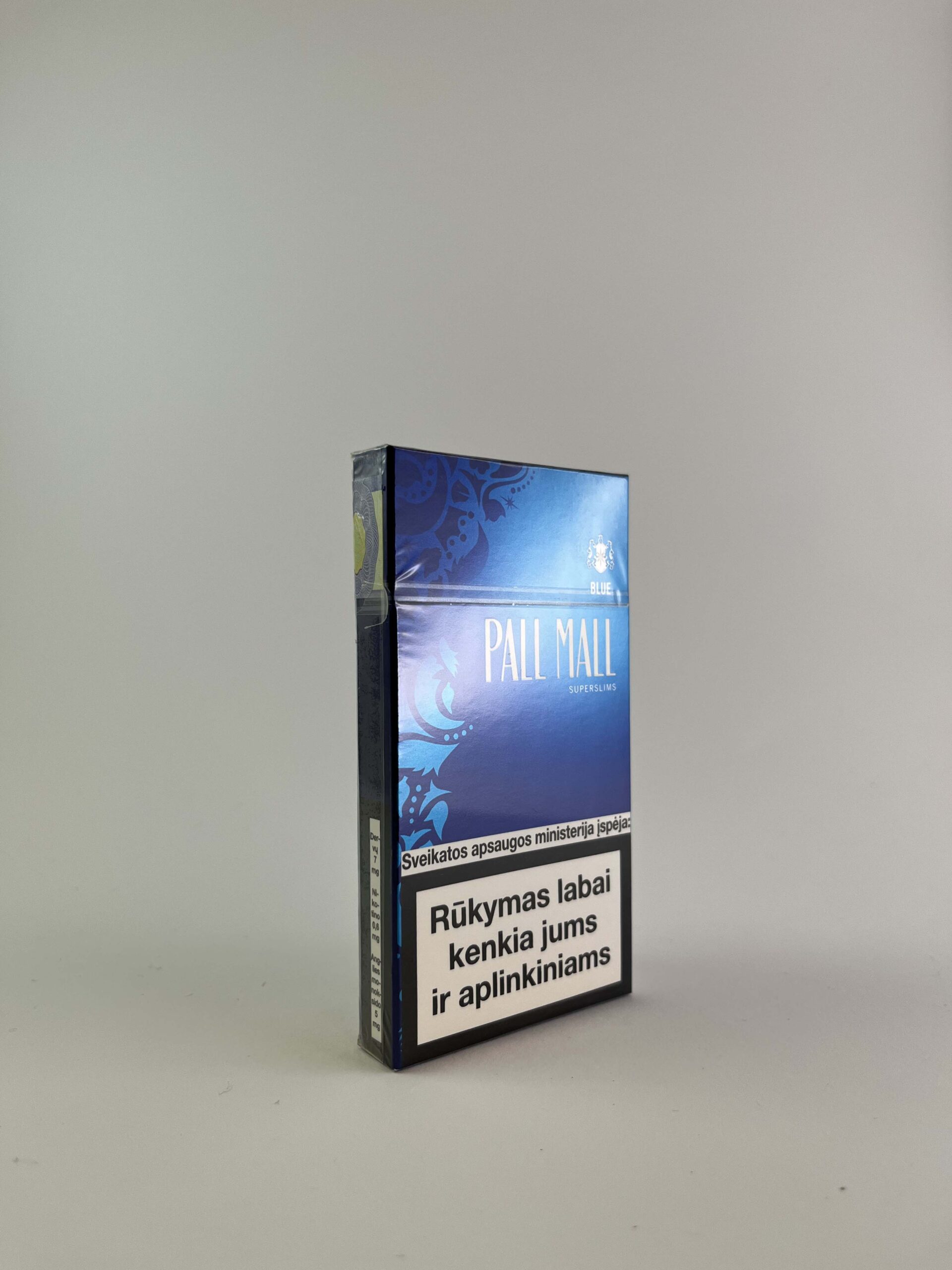 Aprašymas: Šis „Pall Mall Blue Super Slims” cigarečių pakelis išsiskiria elegantišku ir moderniu dizainu, akcentuotu mėlyna spalva bei subtiliomis grafinėmis detalėmis. Pall Mall prekės ženklas yra gerai žinomas už prieinamą kainą ir plataus asortimento pasirinkimą. Superslims formos pakelis yra orientuotas į vartotojus, kurie pageidauja plonesnio tipo cigarečių. Sveikatos apsaugos ministerijos įspėjimas apie rūkymo žalą pabrėžia rūkymo keliamus pavojus sveikatai.