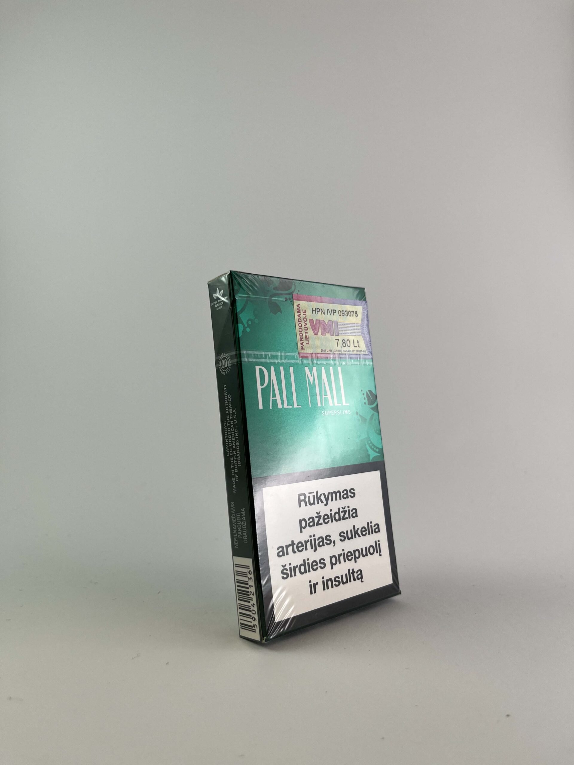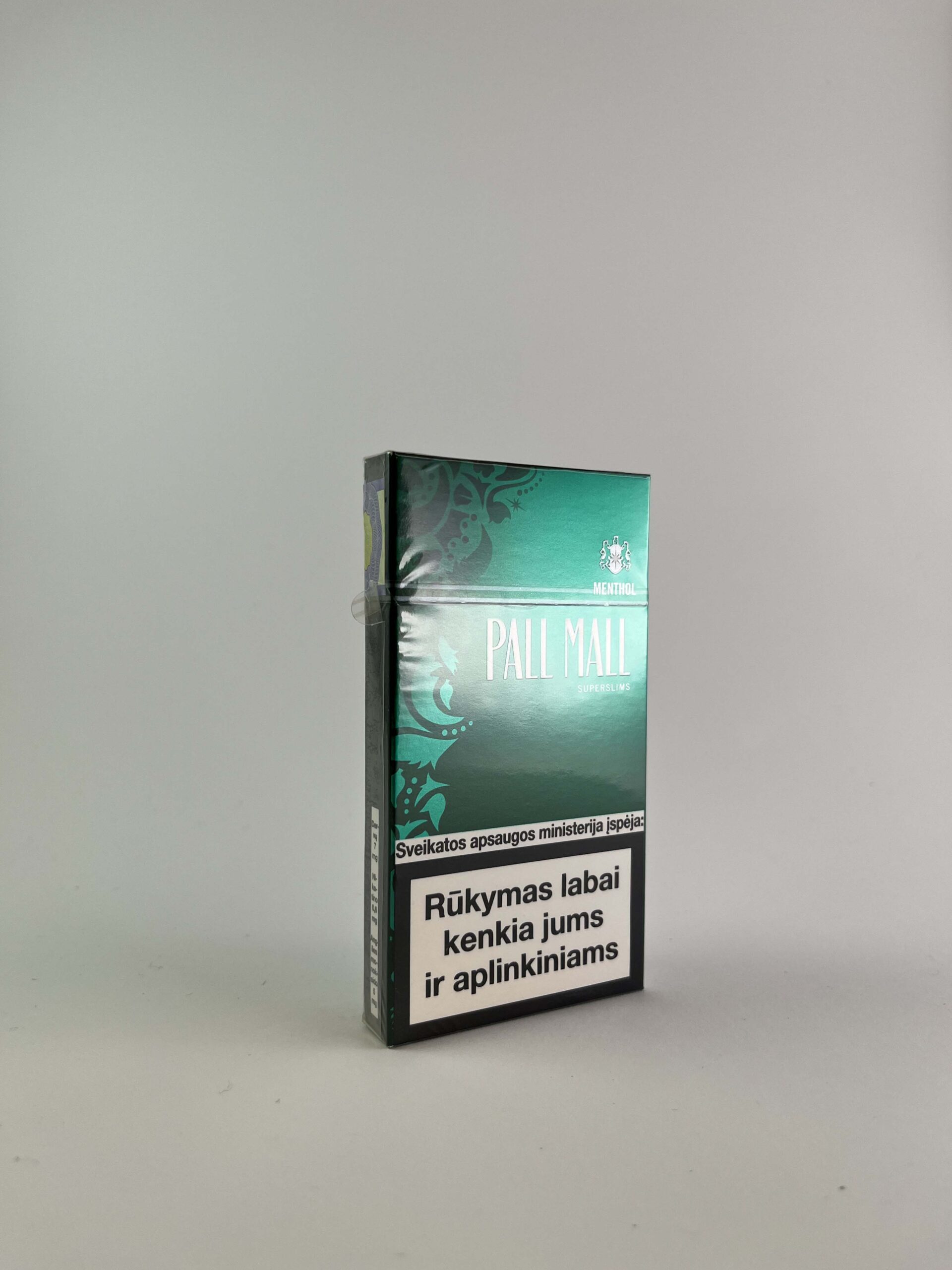 Aprašymas: Šis Pall Mall cigarečių pakelis išsiskiria elegantišku ir moderniu dizainu, kuris atspindi mentolio skonį per žalią spalvą. Pakuotės centre esantis logotipas ir dekoratyviniai elementai pabrėžia prekės ženklo unikalumą. Pall Mall „Menthol Super Slims” yra orientuotas į rūkalius, ieškančius lengvesnio ir elegantiškesnio dizaino. Ant pakelio pateiktas ryškus įspėjimas apie rūkymo žalą, skirtas atkreipti dėmesį į sveikatos pavojus.