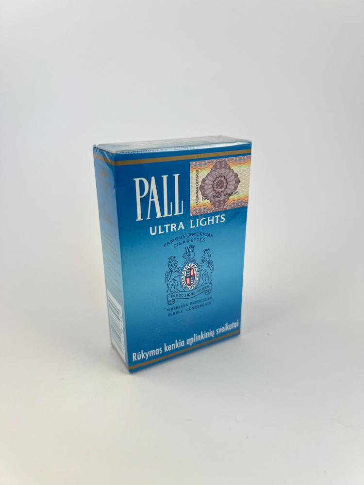 Description: Šis „Pall Mall Ultra Lights“ cigarečių pakelis pasižymi ryškiu mėlynu fonu su baltu logotipu ir auksine linija viršuje. Centre pavaizduotas prekės ženklo herbas ir šūkis „Wherever Particular People Congregate“. Tai klasikinis amerikietiško stiliaus pakelis, skirtas Lietuvos rinkai – nurodyta sveikatos apsaugos ministerijos įspėjimo formuluotė bei matomas originalus lietuviškas akcizo lipdukas.