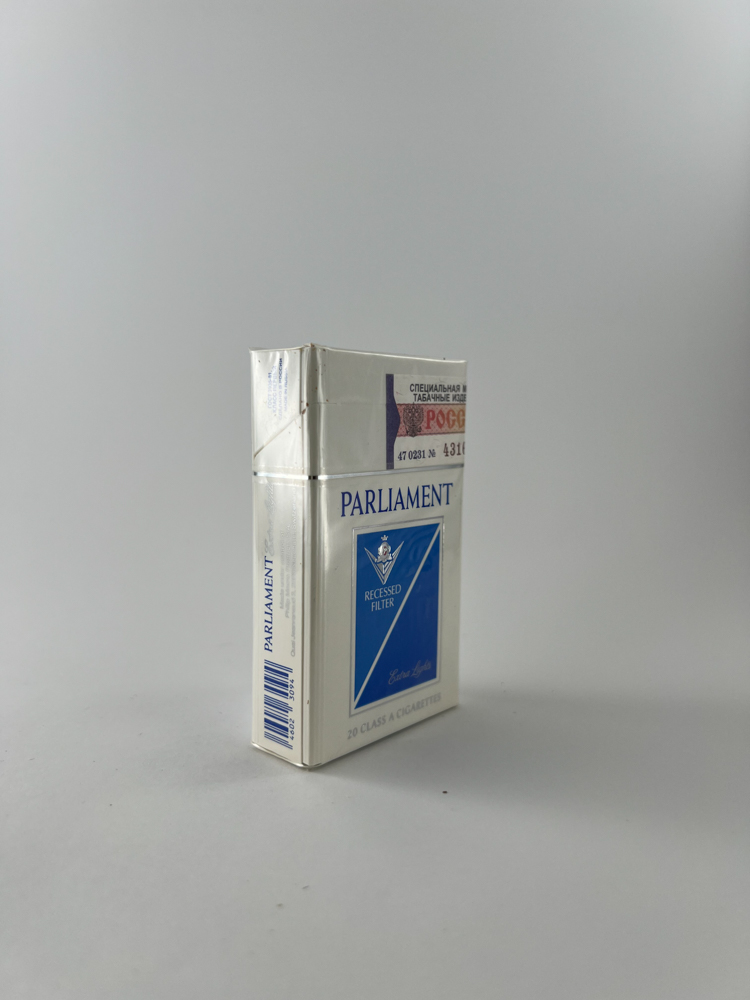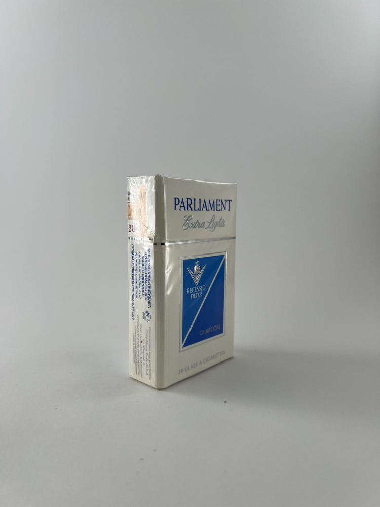 Šis „Parliament Extra Lights“ cigarečių pakelis išsiskiria savo ikoniniu „recessed filter“ (įdubusio filtro) dizainu ir išryškintu mėlynu kvadratu su sidabriniais elementais. Užrašas „Charcoal“ rodo, kad naudojamas anglies filtras, kuris buvo rinkodariškai siejamas su papildomu dūmų filtravimu. Pakelio stilius elegantiškas ir švarus, atitinkantis aukščiausios klasės segmentą, kuriam „Parliament“ visada priklausė. Pakuotė neišpakuota, su Rusijos banderole – tai buvo oficialiai platintas produktas šioje rinkoje.