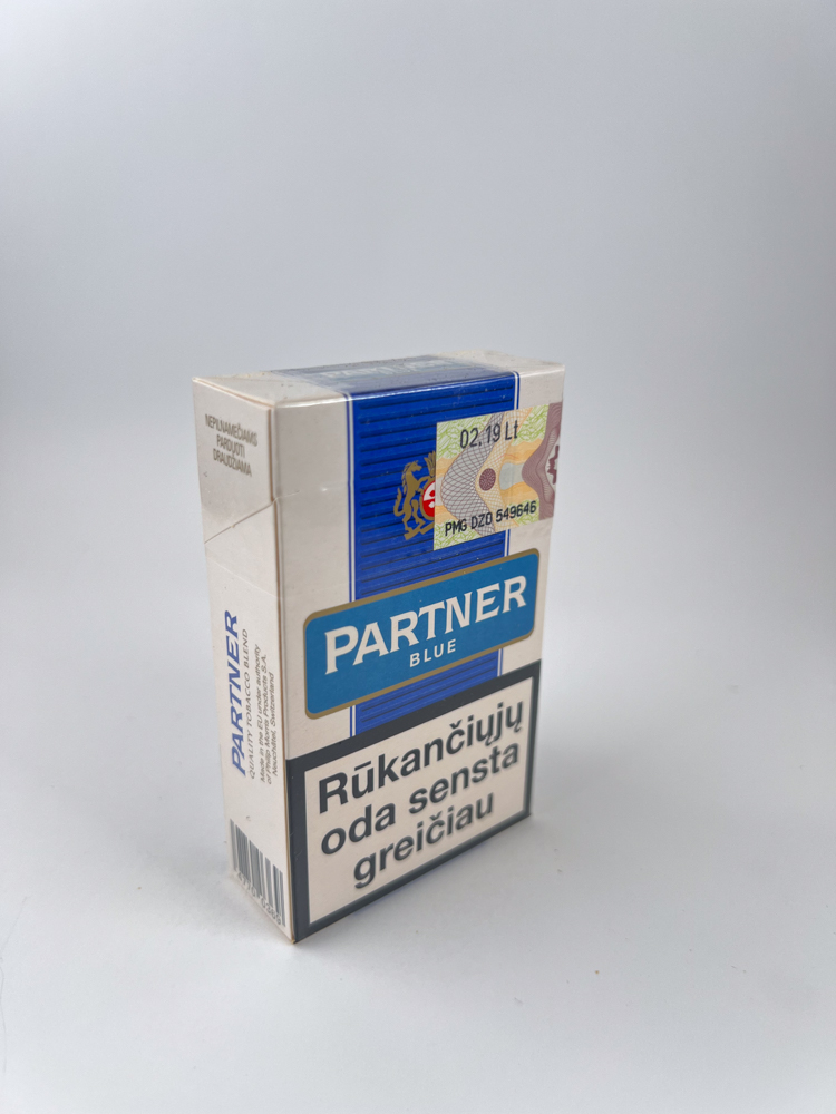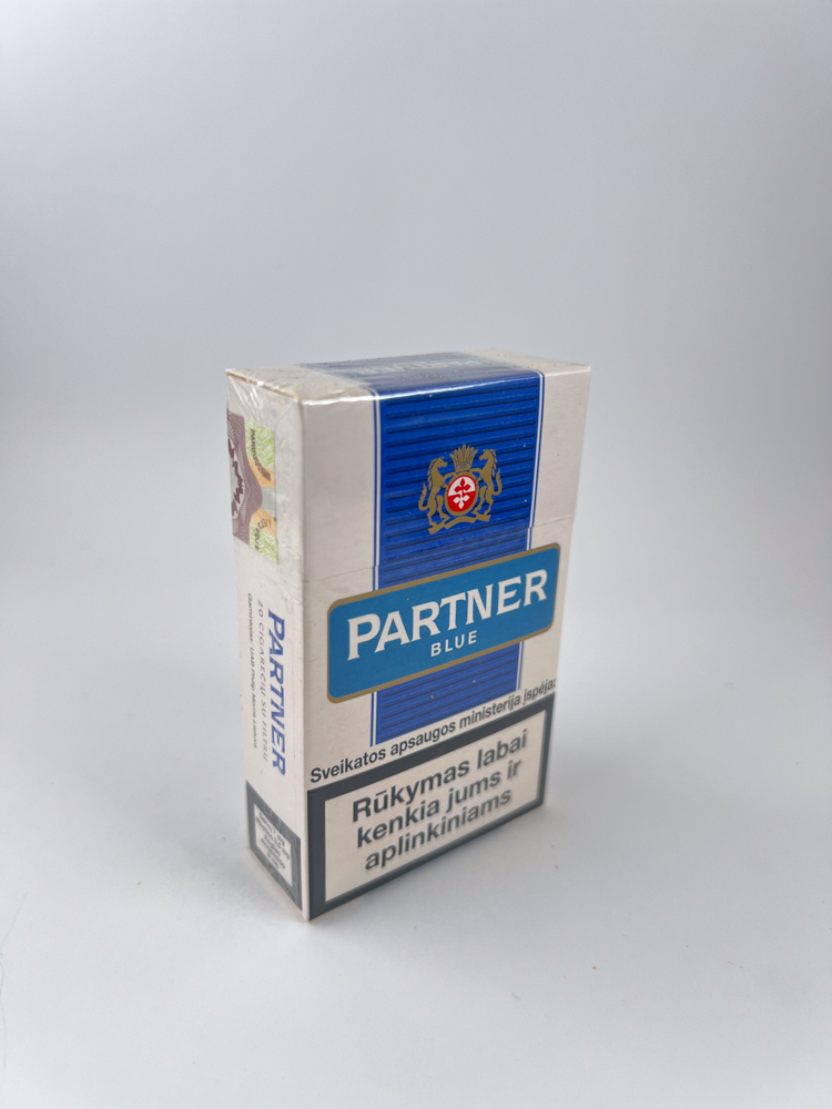 „Partner Blue“ – tai vidutinio stiprumo versija iš „Partner“ serijos, užimanti vietą tarp „Red“ ir „Silver“. Dizainas išlaiko klasikinį serijos formatą: baltas fonas, mėlynas vertikalus įspaustas laukas viršutinėje dalyje, o centre – rėmelis su logotipu „PARTNER BLUE“, įkomponuotu į subtilų auksinį kontūrą. Viršuje pavaizduotas herbas su liūtais ir raudonu skydeliu suteikia oficialumo įspūdį.