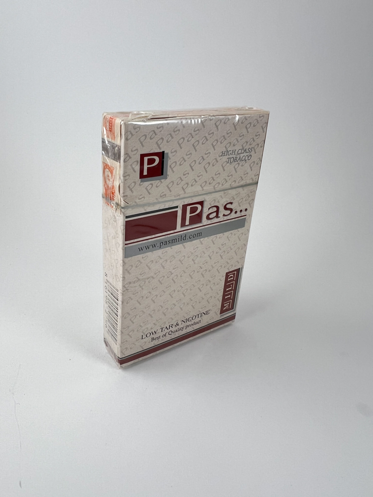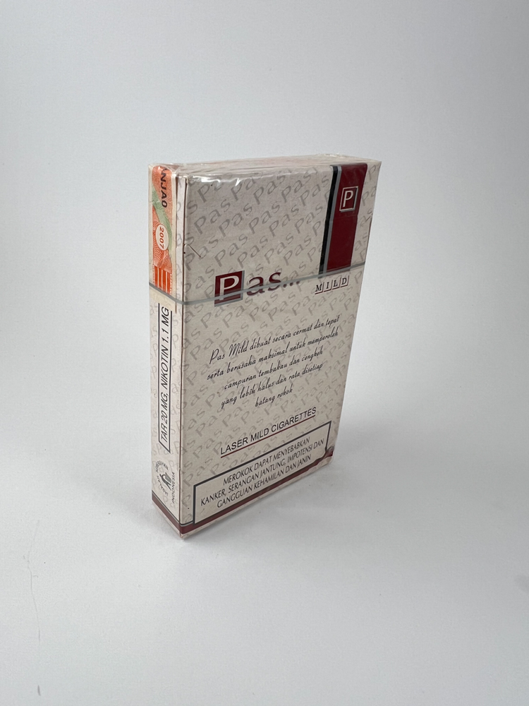Description: „Pas… Mild“ yra Indonezijos gamintojo sukurta lengvųjų cigarečių versija, akcentuojanti mažesnį dervų ir nikotino kiekį („Low Tar & Nicotine“). Pakelis šviesiai kreminės spalvos su raudonais ir pilkais grafiniais elementais, pagrindiniame fone išdėstyta pasikartojanti „Pas“ užrašų seka. Priekinėje dalyje pabrėžiamas minimalistinis prekės ženklo pavadinimas su raudonu kvadratu ir „P“ simboliu. Ant šoninės pusės matomas tar ir nikotino kiekis. Galinėje pusėje pateiktas trumpas tekstas apie gamybos kokybę bei naudojamą „laser mild cigarettes“ technologiją. Taip pat yra įspėjimas indonezų kalba apie rūkymo žalą sveikatai. Pakelis uždarytas akciziniu ženklu su „2007“ įrašu, kas padeda tiksliau nustatyti laikotarpį.