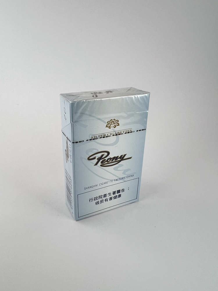 The Peony cigarette pack features a light silver design with an elegant, calligraphic "Peony" inscription and the usual filter cigarette marking - "Filter Cigarettes". The front part indicates the strength of 11 mg, and the manufacturer - Shanghai Cigarette Factory, China. The warning on the back is in Chinese, suggesting that the package was intended for the Asian market (most likely Taiwan). The design is modern, clean, with subtle lines and a symbolic sign.