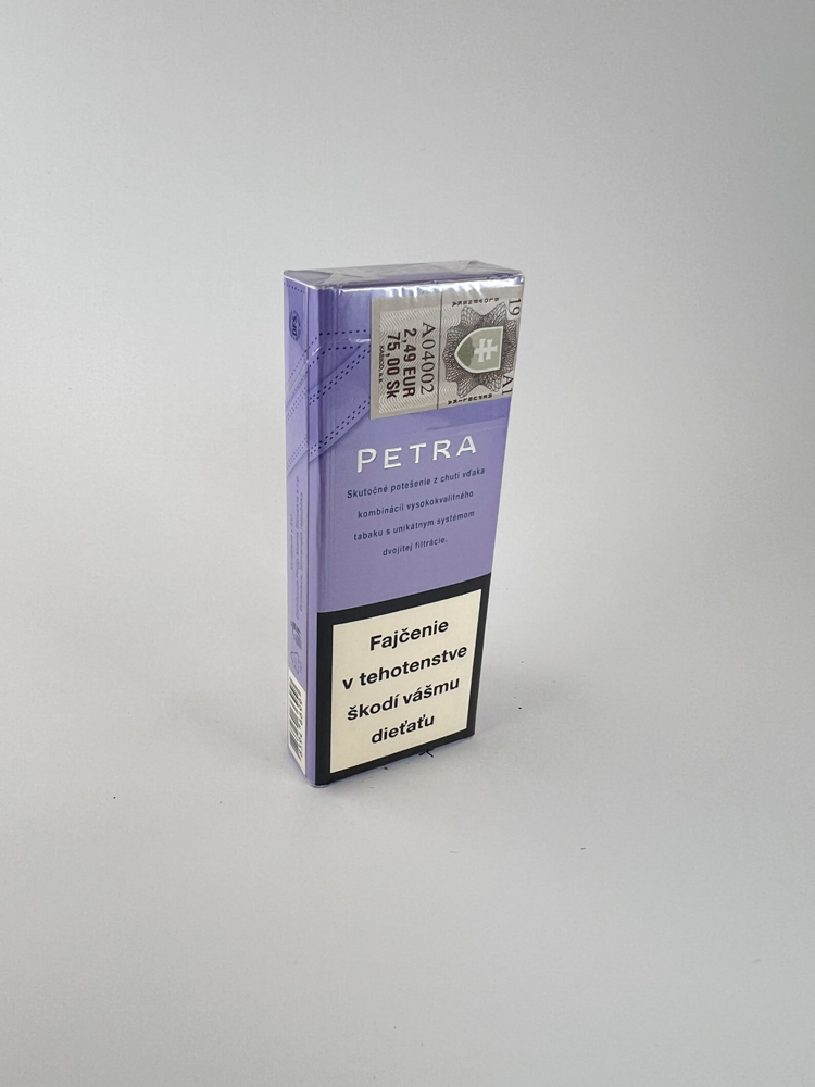 Description: Light lilac flip-top package, in the center – silver „PETRA Slims“, at the bottom – black warning „Fajčenie vášné škodí…“ in Slovak. At the top – foil with serial number labels. The design is modern, minimalist, with good originality, with natural signs of age.