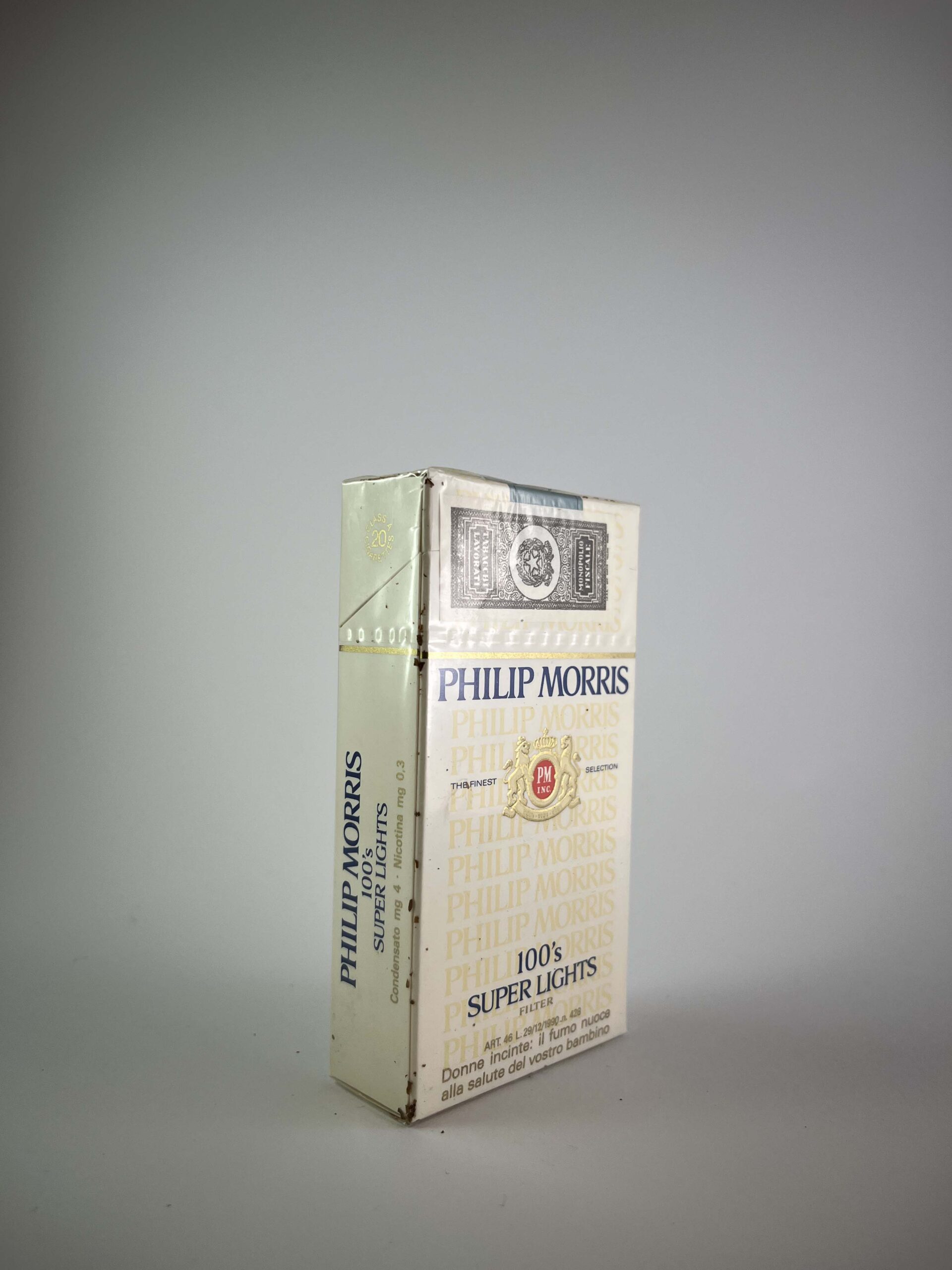 This Philip Morris 100's Super Lights cigarette pack has an elegant design, featuring a subtle combination of white and gold with the brand logo in the center. The pack features Italian health warnings about the dangers of smoking, indicating that this pack was intended for the Italian market. The Super Lights name emphasizes the milder tobacco flavor experience, while the longer 100 mm format adds to its uniqueness. This is a collector's item that may be of interest both for its brand reputation and its historical value.