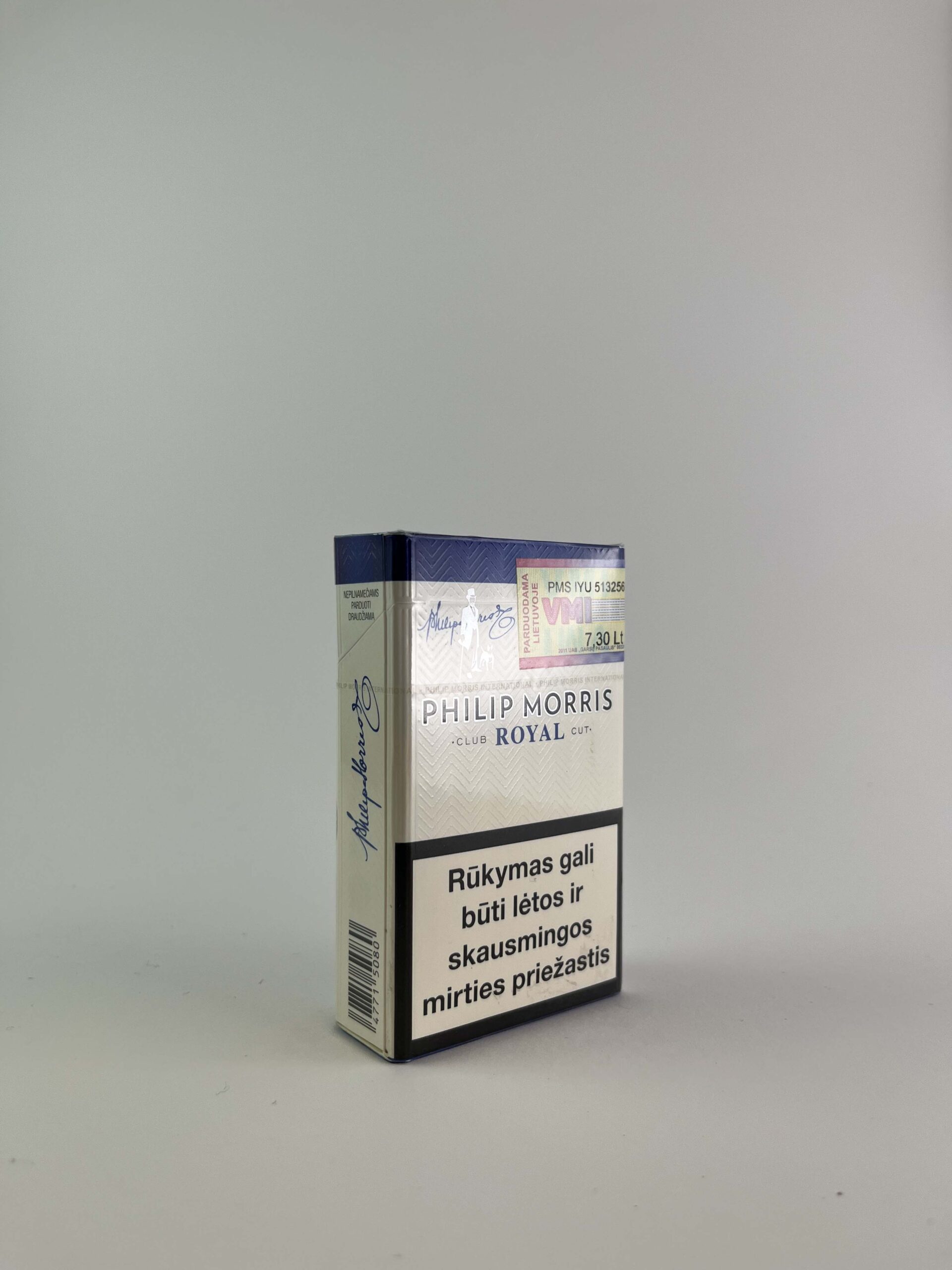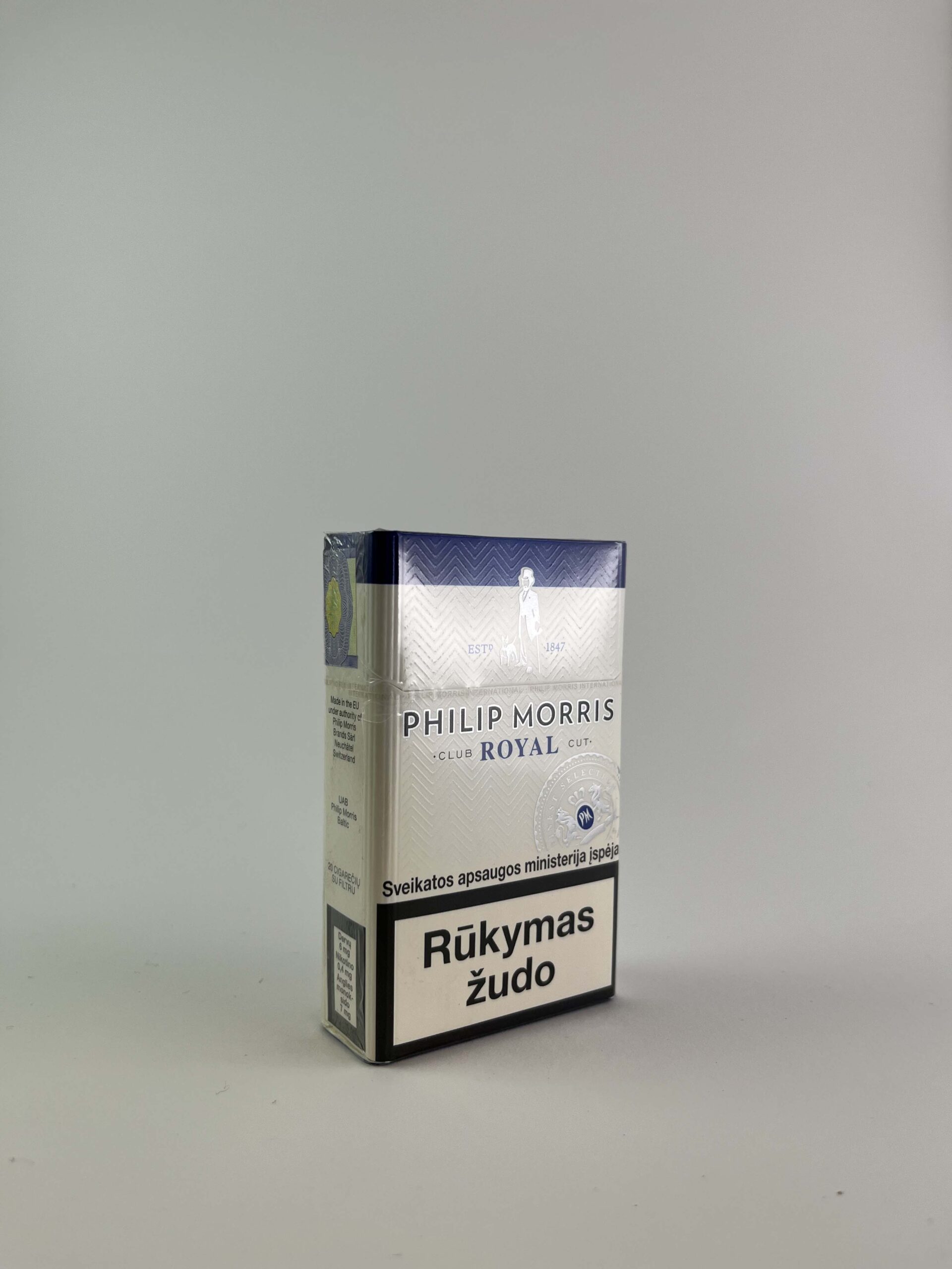 Description: Šis „Philip Morris Club Royal” cigarečių pakelis pasižymi elegantišku, minimalistiniu dizainu, kur dominuoja sidabrinė ir mėlyna spalvos. Ant pakelio pavaizduotas subtilus ornamentas su prekės ženklu ir „Club Royal” užrašu. Šis dizainas suteikia solidumo ir patikimumo įspūdį. Pakelio apačioje esantis įspėjimas apie rūkymo žalą pabrėžia sveikatos rizikas.