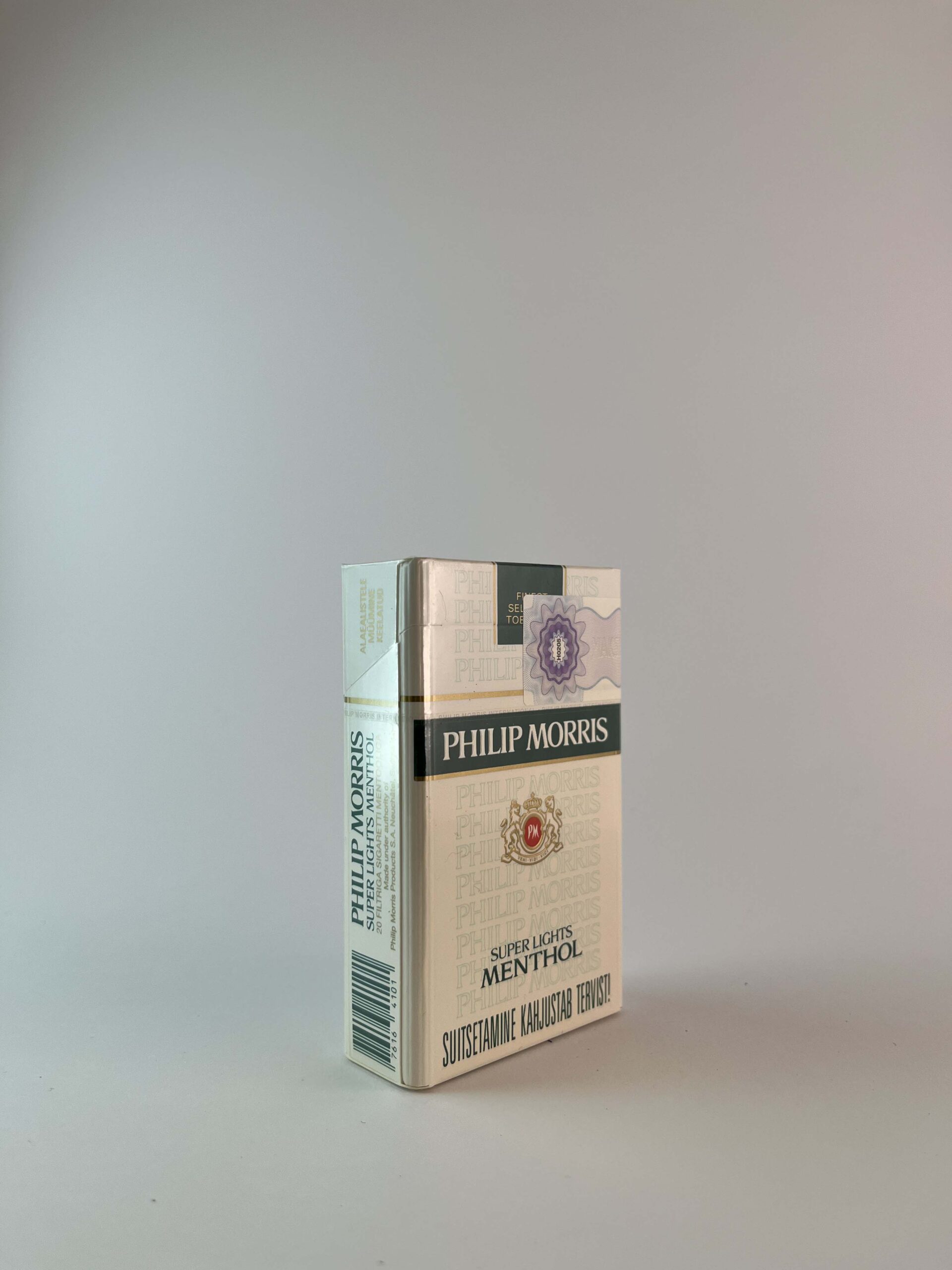 Description: This Philip Morris Super Lights Menthol cigarette pack features an elegant design with minty accents. The packaging subtly incorporates the brand's symbolism, and the health warnings are presented clearly and legibly. This edition of cigarettes is designed for those looking for a lighter smoke with a refreshing minty flavor.