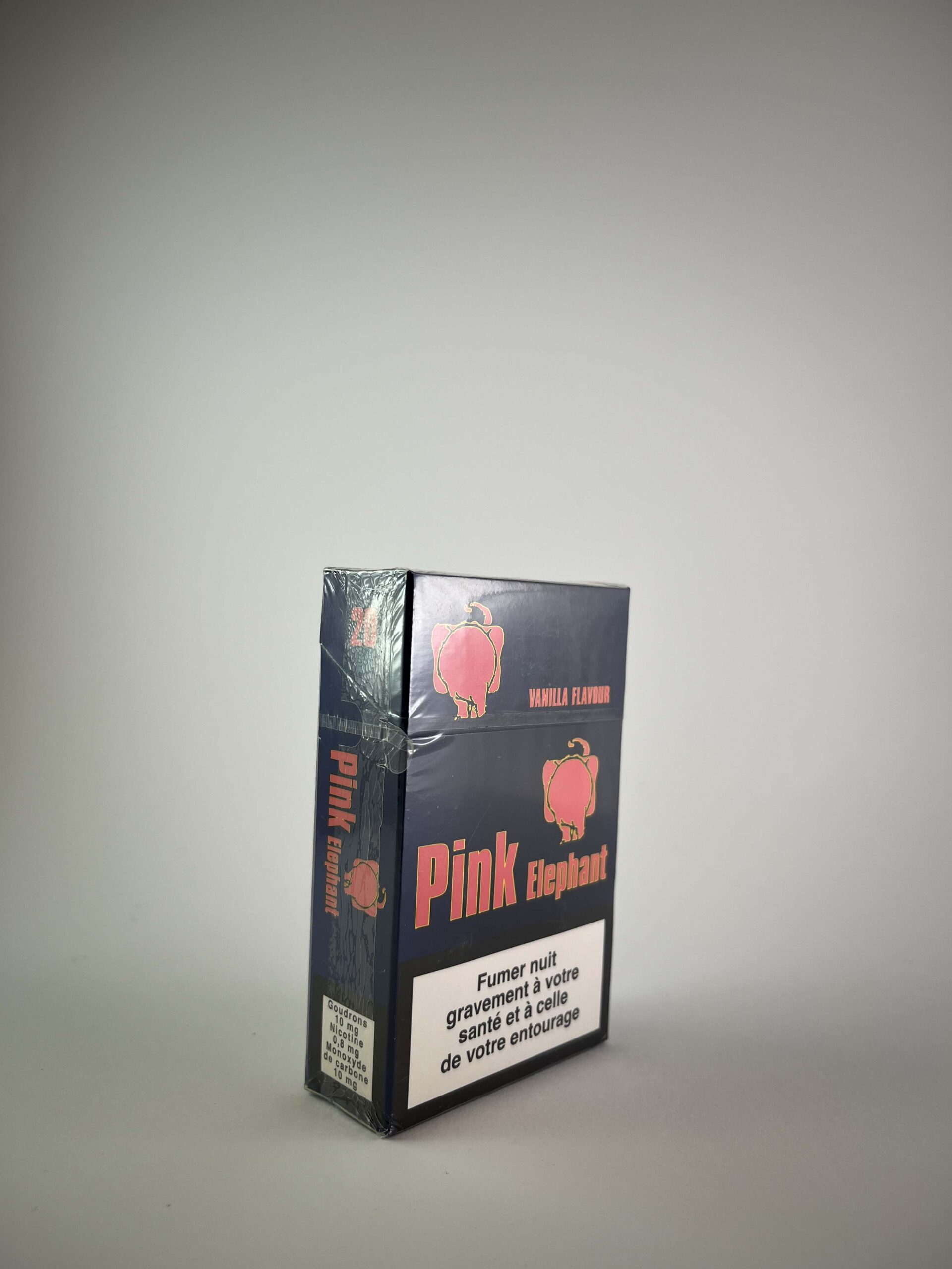 Description: This cigarette pack features a unique design with a distinctive pink elephant logo that highlights the brand and stands out in the market. The name "Vanilla Flavour" refers to a flavour that is popular with niche smokers. The dark background contrasts with the bright logo, giving it a modern feel. The health warnings are in French, highlighting the health requirements in France.