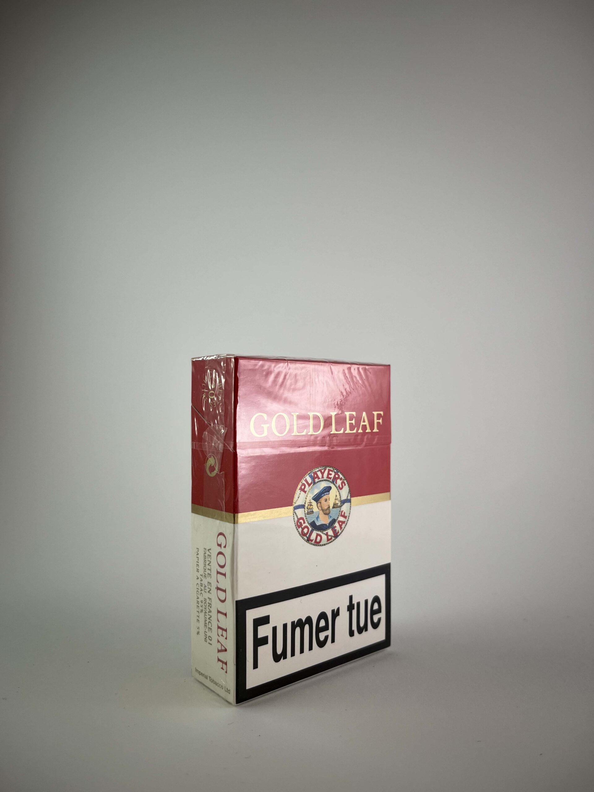 Description: Player's Gold Leaf cigarette pack features a classic and luxurious design. The red and white colour combination with gold accents conveys the high quality standard that is characteristic of the Player's brand. The sailor logo on the pack symbolises the brand's historical connection with the UK's maritime tradition. The health warnings are in French, indicating that the pack was intended for export to French-speaking regions.