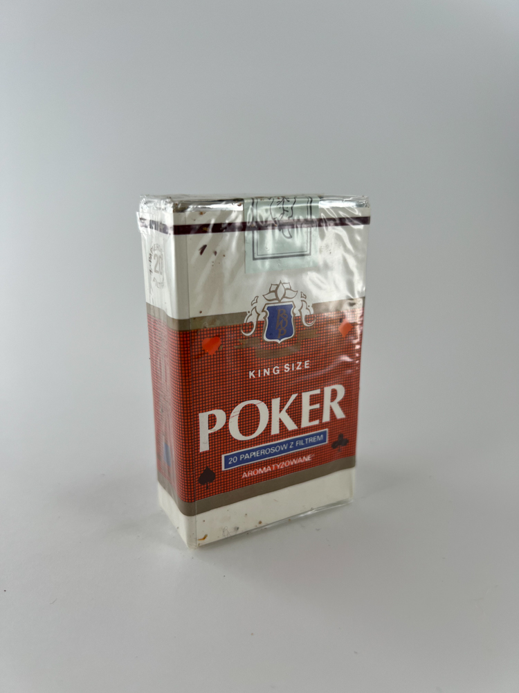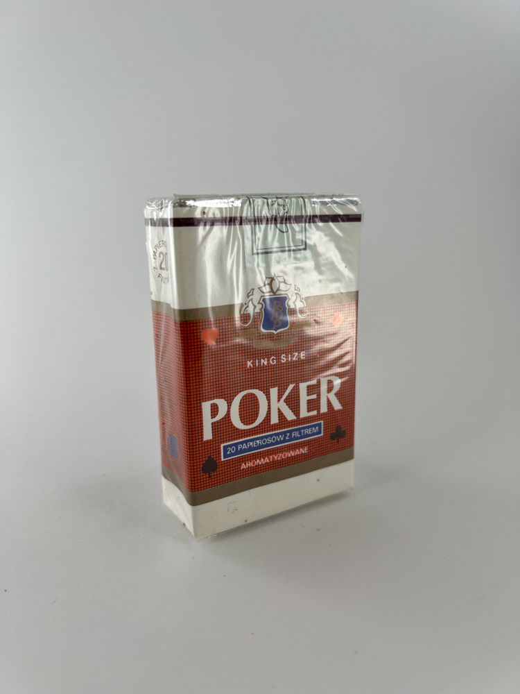 „POKER“ – tai Lenkijos vidaus rinkai skirtas prekės ženklas, kurio pavadinimas ir dizainas tiesiogiai siejasi su lošimų tema. Pakelio apačioje išdėstyti keturi kortų simboliai (širdis, vynas, kryžius, būgnas), o dominuoja raudonai rudas fonas su mėlynu logotipu ir užrašu “Aromatyzowane”, reiškiančiu kvapiąsias cigaretes. Pakelis paprastas, be modernių sveikatos įspėjimų – tai tipiškas 9-ojo dešimtmečio pabaigos ar 10-ojo dešimtmečio pradžios gaminys.