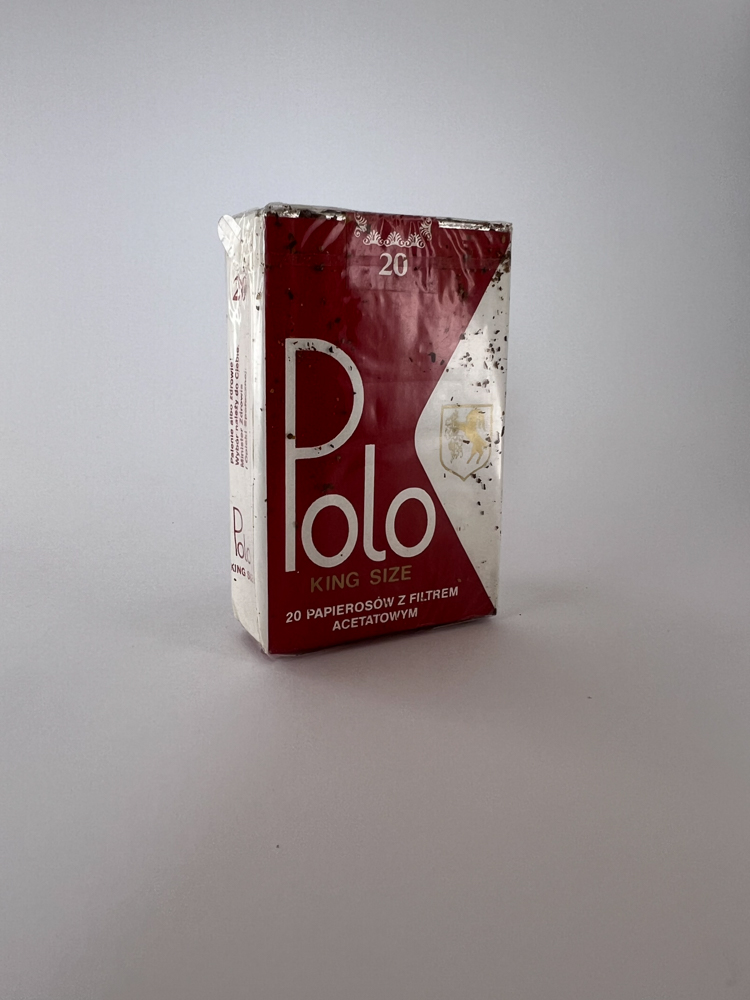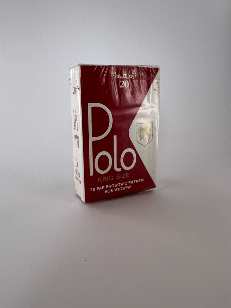 This Polo King Size cigarečių pakelis, kuris išsiskiria raudonai balta spalvų schema su diagonalia dizaino linija. Pakuotės priekyje nurodyta: