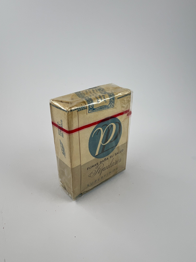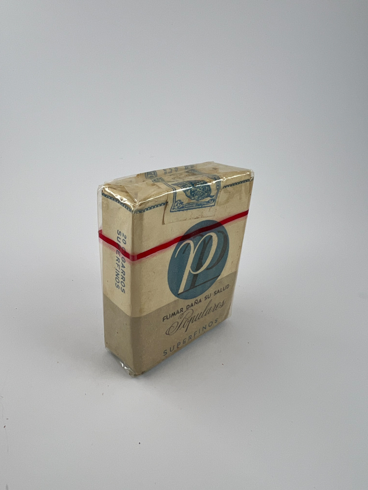 Description: This pack of Populares Superfinos cigarettes features a minimalist design – a light beige background and a blue logo with the letter „P“ in the center. The bottom part indicates the series „Superfinos“, and the top part – a warning in Spanish „Fumar daña su salud“ („Smoking is harmful to your health“), reflecting the origin of the pack from a Spanish-speaking country. The pack is sealed with a Cuban excise stamp, which testifies to the authenticity and character of the era. The shape of the cigarettes is classic, and the pack format is traditional, intended for everyday use.