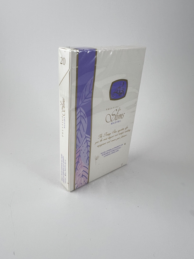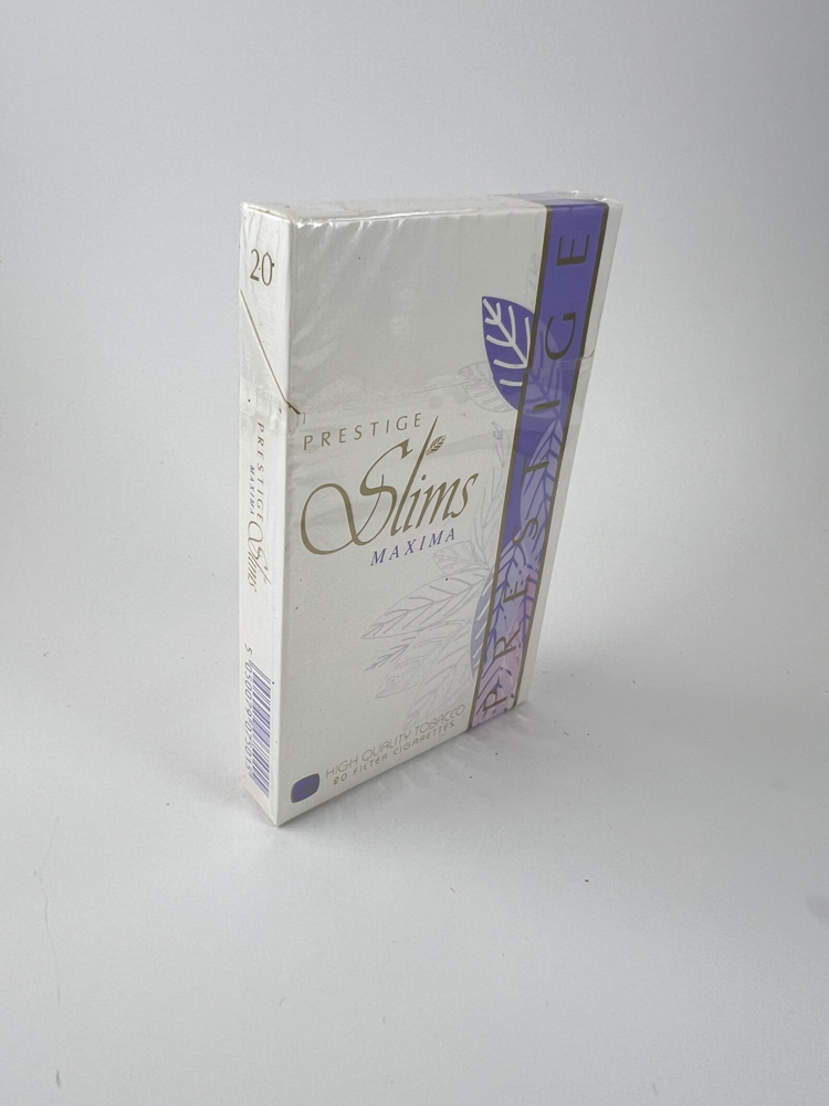 Description: White/pearlescent background with a purple vertical stripe on the right, large embossed leaf motif, gold/light gray print elements. On the front: inscriptions: "PRESTIGE", "Slims", "MAXIMA", below: "HIGH QUALITY TOBACCO – 20 FILTER CIGARETTES". On the left side: the number "20". On the back: a logo panel and text about production by European Tobacco PLC (London). The package is wrapped in film; small film bends/scratches are visible at the upper left corner.