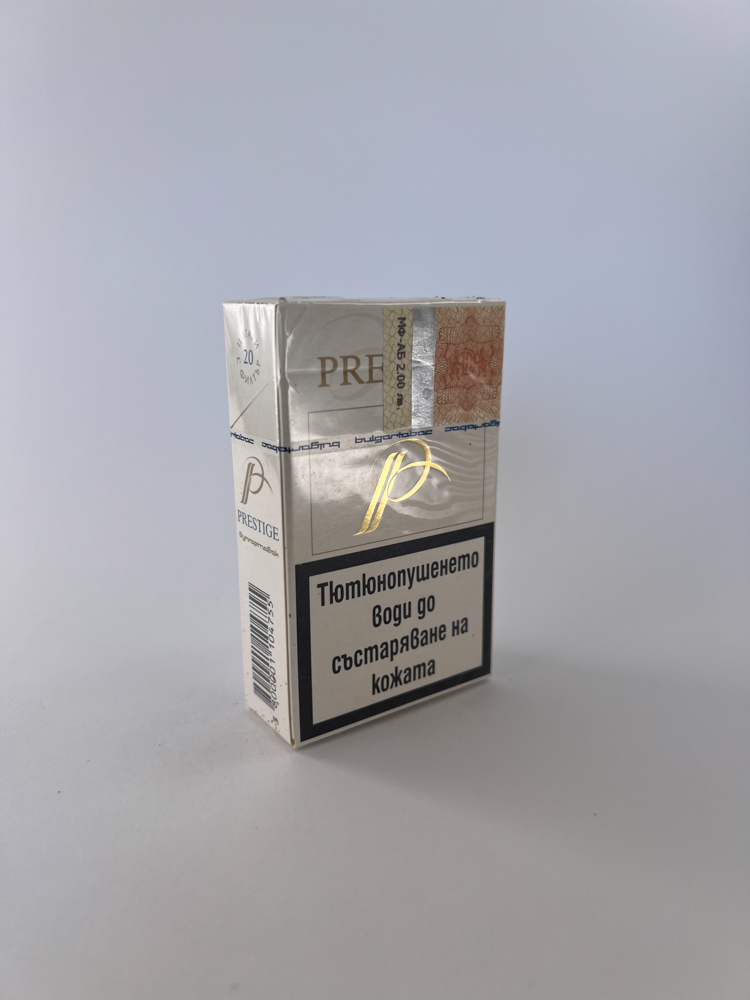 This pack of Prestige White cigarettes is an example of modern aesthetics - a white background with shiny gold accents, a subtle logo and a minimalist "King Size" inscription. The "bulgartabac" inscription is visible on the top band, indicating its affiliation with the Bulgarian State Tobacco Factory Group. Warnings about the harms of smoking are provided in Bulgarian: „"Pusheneto Kills"“ ("Smoking kills") and „"Tobacco-pushed water until aging on the skin"“ ("Smoking causes skin aging"). Above, a Bulgarian excise sticker with the price: 2.00 лв is clearly visible.