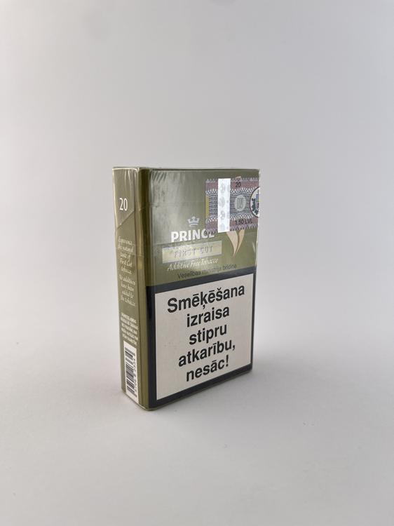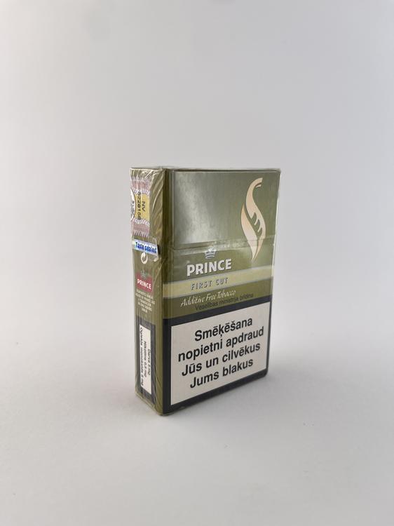 Šis „Prince First Cut“ cigarečių pakelis pasižymi sodriu žalsvai alyviniu dizainu, kuris suteikia solidumo ir išskirtinumo pojūtį. Priekinėje dalyje aiškiai matomas „Prince“ logotipas bei „First Cut“ pavadinimas, papildytas „Additive Free Tobacco“ žymėjimu, pabrėžiančiu natūralesnio produkto kryptį. Stilizuotas liepsnos simbolis viršuje yra būdingas šios linijos dizaino elementas. Ant pakelio pateikti latviški sveikatos įspėjimai ir Latvijos akcizo ženklas, nurodantys šio varianto priklausymą Latvijos rinkai. Bendras dizainas modernus, tačiau išlaiko klasikinį ir atpažįstamą „Prince“ identitetą.