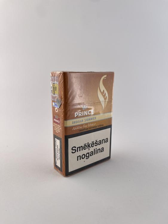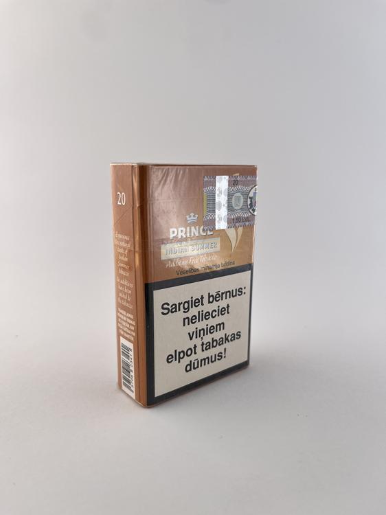 Šis „Prince Indian Summer“ cigarečių pakelis pasižymi šiltu, rudai oranžiniu dizainu, kuris vizualiai perteikia rudens („Indian Summer“) tematiką. Priekinėje dalyje išsiskiria subtilus spalvų perėjimas bei stilizuotas liepsnos simbolis, suteikiantis pakeliui elegantišką ir šiek tiek išskirtinį įvaizdį. „Additive Free Tobacco“ žymėjimas pabrėžia orientaciją į natūralesnio produkto segmentą. Ant pakelio pateikti latviški sveikatos įspėjimai ir Latvijos akcizo ženklas, aiškiai nurodantys šio varianto priklausymą Latvijos rinkai. Bendras dizainas modernus, tačiau išlaiko solidų ir santūrų „Prince“ linijos identitetą.