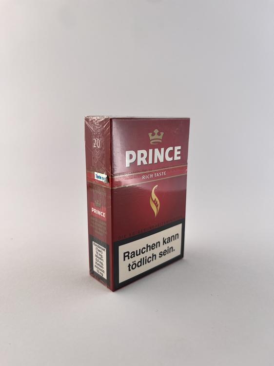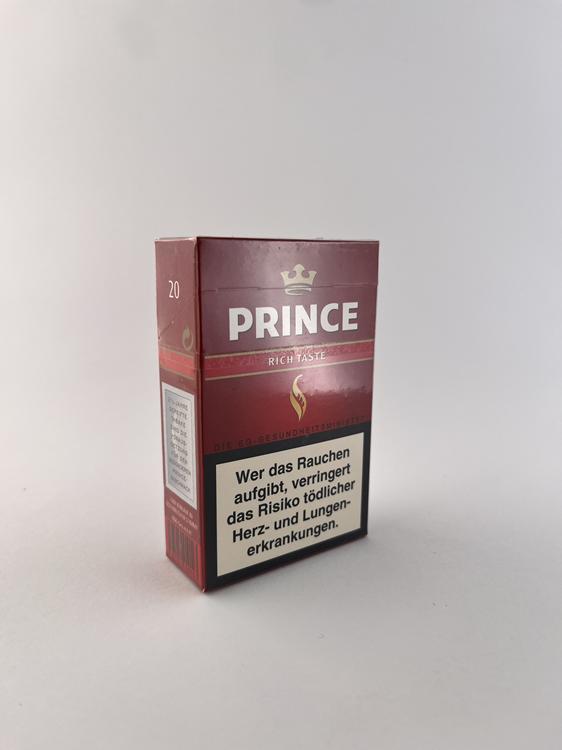 Šis „Prince Rich Taste“ cigarečių pakelis pasižymi sodriu tamsiai raudonu dizainu, kuris būdingas stipresnio skonio („rich/full flavor“) segmentui. Priekinėje dalyje išryškintas „Prince“ logotipas su karūna bei stilizuota liepsna centre, kuri yra vienas pagrindinių šio prekės ženklo vizualinių elementų. Dizainas minimalistinis, tačiau kontrastingas ir aiškiai orientuotas į klasikinį stipresnių cigarečių įvaizdį. Ant pakelio pateikti vokiški sveikatos įspėjimai, kas rodo, jog šis konkretus variantas skirtas Vokietijos rinkai. Bendras įspūdis – solidus, tradicinis ir lengvai atpažįstamas.