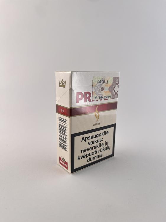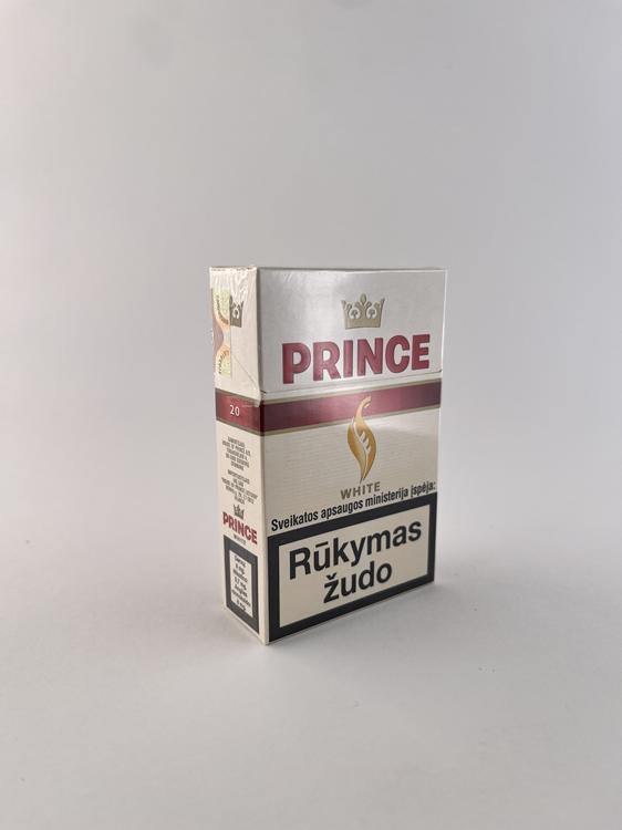 Šis „Prince White“ cigarečių pakelis pasižymi švariu ir lengvu dizainu, kuriame dominuoja balta spalva su subtiliu rausvu akcentu. Priekinėje dalyje aiškiai išryškintas „Prince“ logotipas su karūna bei stilizuota liepsna, o „White“ pavadinimas nurodo švelnesnio, lengvesnio skonio segmentą. Dizainas minimalistinis, estetiškai subalansuotas ir būdingas „light“ kategorijai. Ant pakelio pateikti lietuviški sveikatos įspėjimai ir Lietuvos akcizo ženklas, patvirtinantys, kad šis variantas skirtas Lietuvos rinkai.