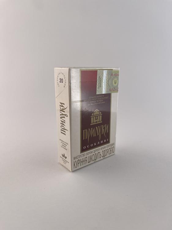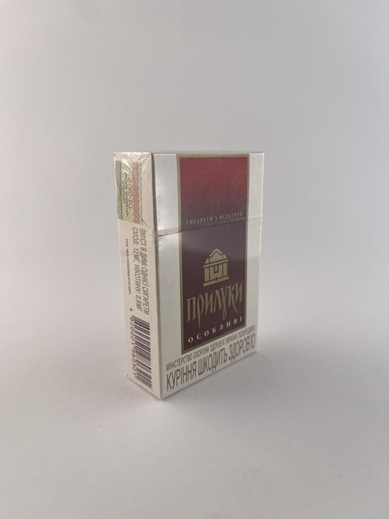 Aprašymas: „Прилуки Особливі“ cigarečių pakelis pasižymi santūriu ir klasikinio tipo dizainu, kuriame dominuoja tamsesnis bordo (raudonai rudas) centrinis blokas. Ši spalva dažniausiai siejama su stipresniu arba „full flavor“ variantu. Centre pateiktas fabriko simbolis ir pavadinimas „Прилуки“, o bendras dizainas išlaiko minimalistinę, vakarietiško tipo stilistiką. Lyginant su kitais šios serijos variantais (light, menthol), šis atrodo solidesnis ir labiau orientuotas į tradicinį skonį.