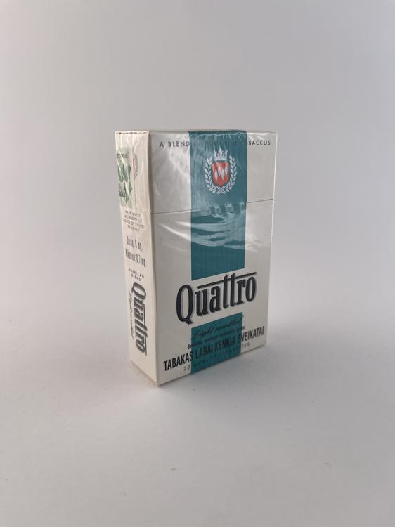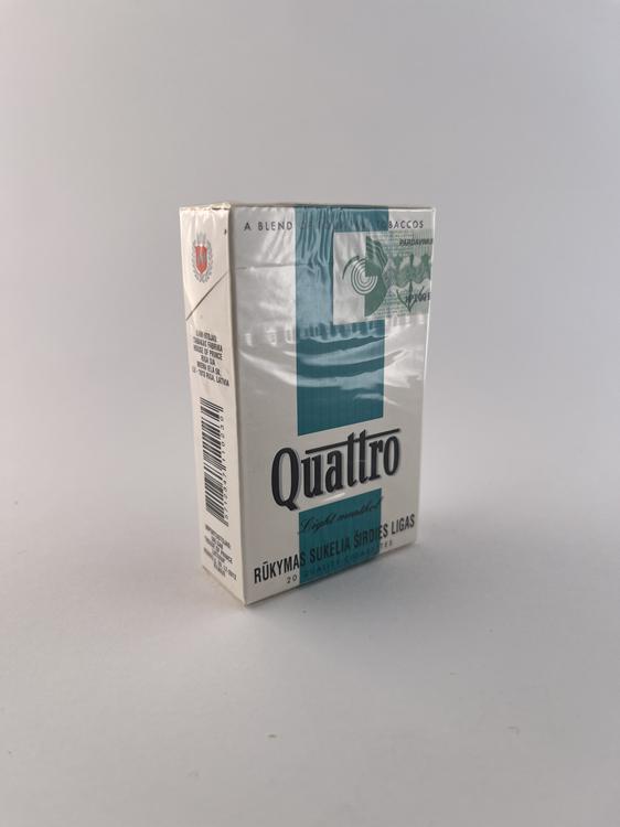 Šis „Quattro“ pakelis priklauso tai pačiai serijai kaip ir raudonas bei kiti variantai, tačiau išsiskiria žalsvai melsva (turkio) vertikalia juosta centre. Toks spalvinis sprendimas dažniausiai siejamas su lengvesniu arba mentoliniu variantu.