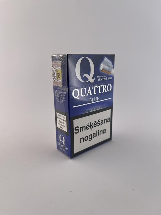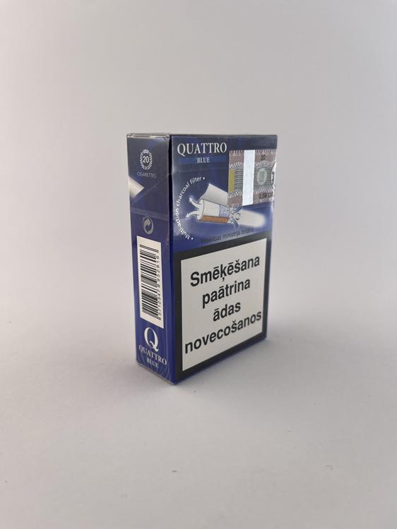 Aprašymas: Šis „Quattro Blue“ cigarečių pakelis yra mėlynos spalvos dizaino variantas, išlaikantis tą pačią stilistiką kaip ir „Classic“ versija – didelis „Q“ simbolis, modernus „multi action charcoal filter“ vaizdavimas ir švarus, technologiškas bendras įvaizdis. Mėlyna spalva tradiciškai žymi lengvesnį variantą („Blue“ kategoriją). Ant pakelio matomi latvių kalbos įspėjimai („Smēķēšana nogalina“, „Smēķēšana paātrina ādas novecošanos“) bei Latvijos akcizo banderolė, todėl aiškiai identifikuojama Latvijos rinka. Šis modelis yra gana tipinis Baltijos regiono „Quattro“ serijos atstovas.