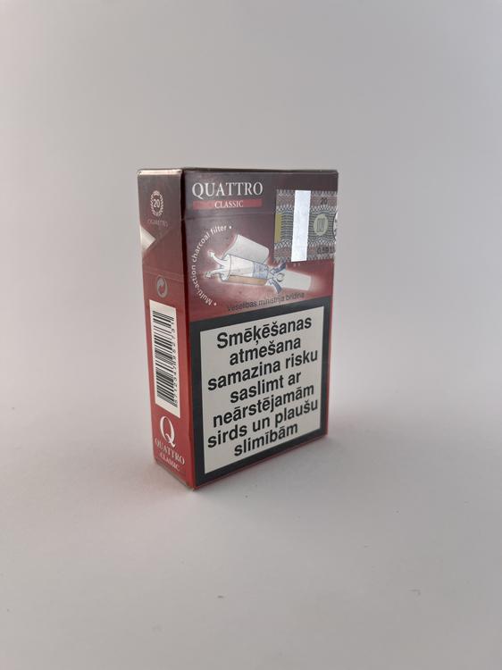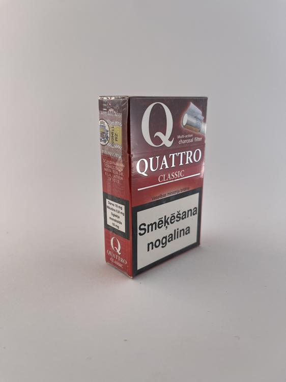 Aprašymas: Šis „Quattro Classic“ cigarečių pakelis išsiskiria ryškiu raudonos spalvos dizainu su dideliu „Q“ simboliu priekyje ir papildomu akcentu – pavaizduotu „multi action charcoal filter“. Dizainas modernesnis nei ankstesnių „Quattro“ versijų, orientuotas į technologinį filtravimo įvaizdį. Ant pakelio aiškiai matomi latvių kalbos sveikatos įspėjimai („Smēķēšana nogalina“, „Smēķēšanas atmešana samazina risku…“), taip pat Latvijos akcizo banderolė, todėl tiksliai nustatoma, kad pakelis skirtas Latvijos rinkai. Šio tipo „Quattro“ pakeliai yra dažnesni nei senesni minimalistiniai variantai, tačiau išlieka įdomūs dėl savo dizaino ir regioninės specifikos.