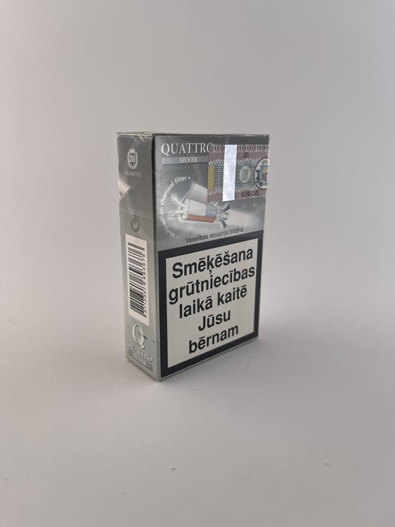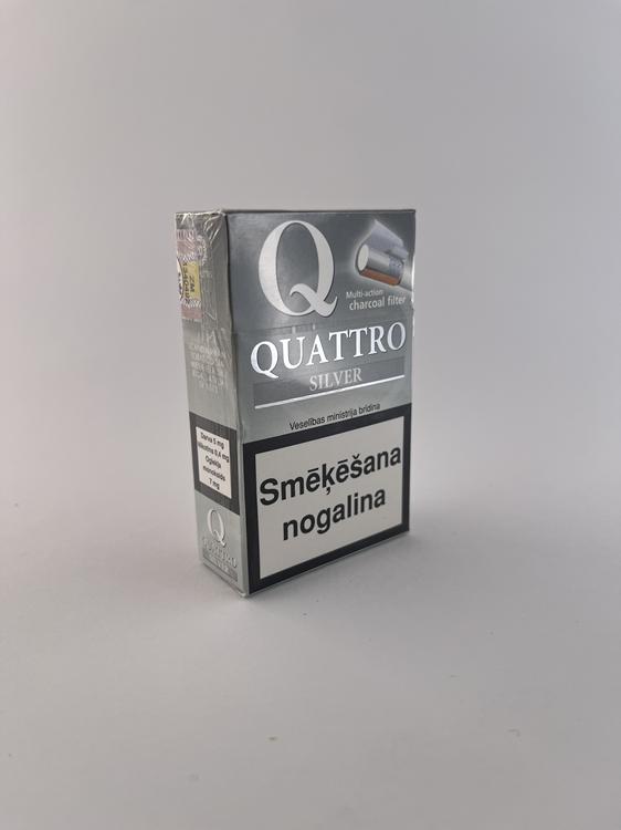 Aprašymas: „Quattro Silver“ cigarečių pakelis išsiskiria moderniu, minimalistiniu dizainu su sidabriniu fonu ir dideliu „Q“ simboliu viršuje. Pakuotėje taip pat pavaizduotas „multi-action charcoal filter“, kas rodo marketinginį akcentą į filtravimo technologiją. Ant pakelio aiškiai matomi latviški įspėjimai („Smēķēšana nogalina“, „Smēķēšana grūtniecības laikā kaitē Jūsu bērnam“), taip pat Latvijos akcizo banderolė, patvirtinanti rinką. „Silver“ variantas paprastai žymi lengvesnio skonio kategoriją. Dizainas orientuotas į modernesnį vartotoją, siekiant sukurti „technologiškai pažangaus“ produkto įvaizdį.