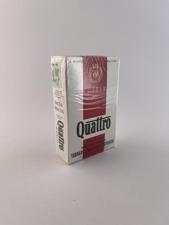 Šis „Quattro“ pakelis yra ryškesnio dizaino nei anksčiau matytos versijos – baltas fonas derinamas su vertikalia raudona juosta centre, kuri suteikia stipresnį vizualinį akcentą. Viršuje matomas herbas su vainiku, o bendras dizainas išlaiko minimalistinį, bet kiek modernesnį stilių nei ankstyvieji variantai.