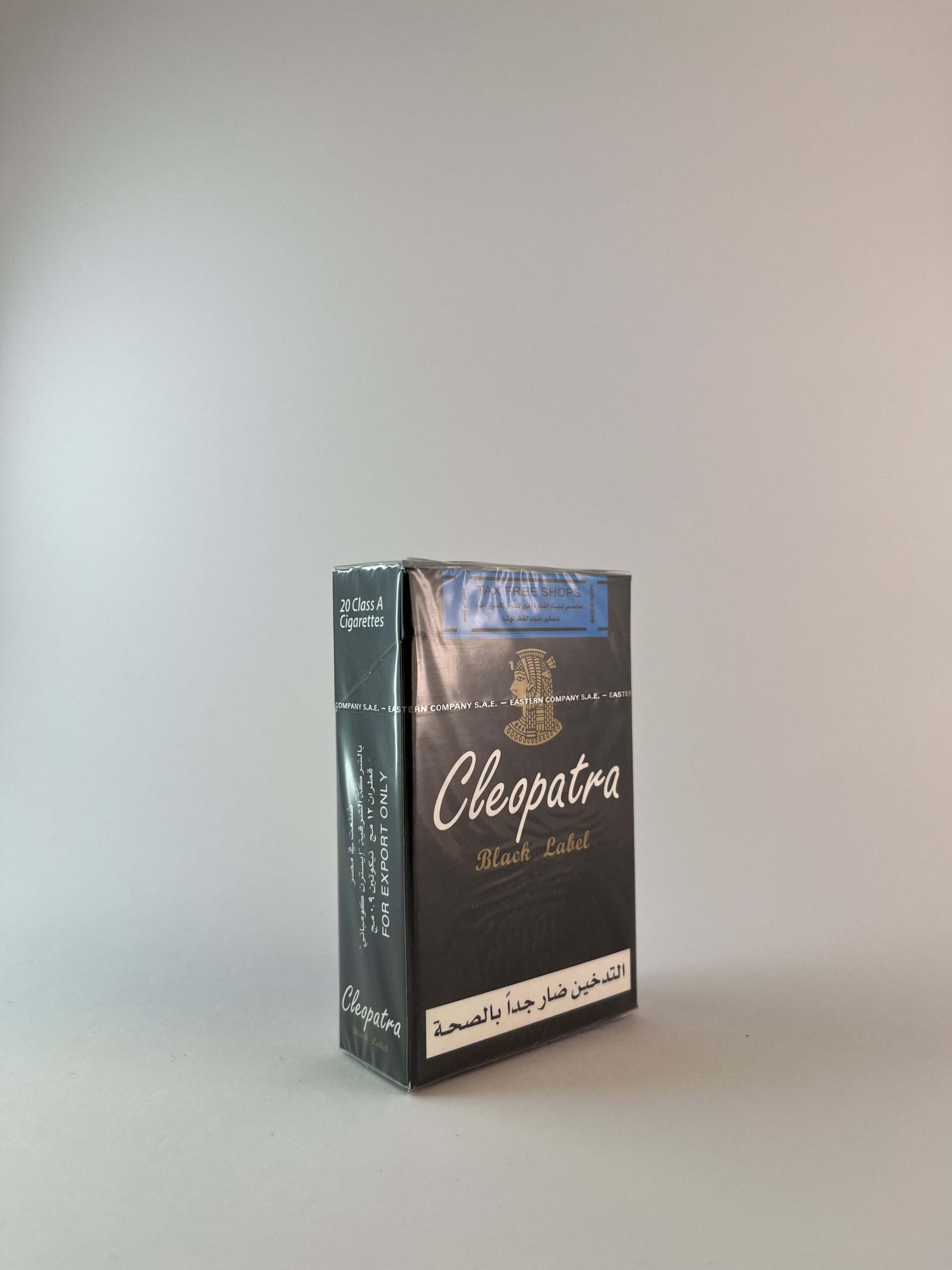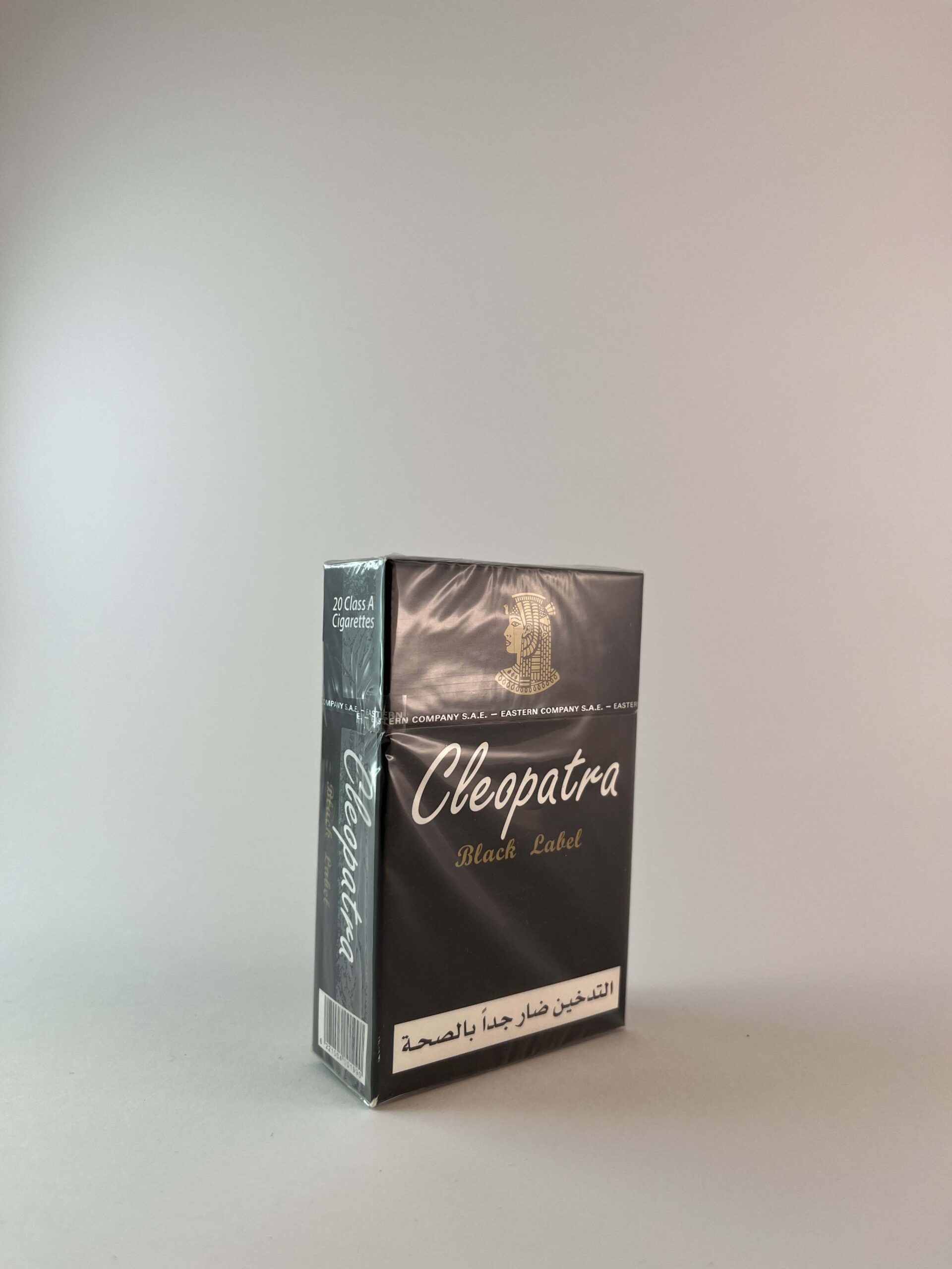 Description: This Cleopatra cigarette pack has an elegant and luxurious design, distinguished by its black and gold colors. The name „Black Label” evokes associations with higher quality and classics. The Cleopatra cigarette brand is known for its local significance in Egypt, and the „Black Label” license is intended for export, as indicated on the package. A warning about the harms of smoking takes up part of the pack, reminding of the health risks.