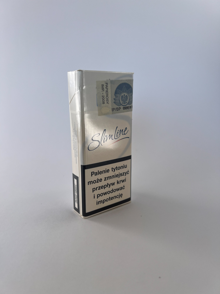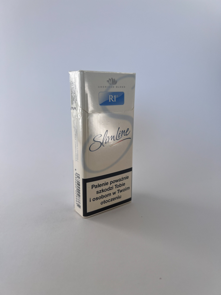 R1 Slim Line is a pack of superslim cigarettes aimed at the health-conscious consumer or the consumer seeking lower tar and nicotine content. The R1 brand is well-known in Europe as a lighter class cigarette manufacturer, belonging to Reemtsma (Imperial Brands). This pack has an elegant, pearly white design, with blue accents and a modern font. Health warnings are presented in two different texts in Polish, and the top of the pack shows the import mark "PAPIEROSY IMP. 2008", indicating import to Poland.