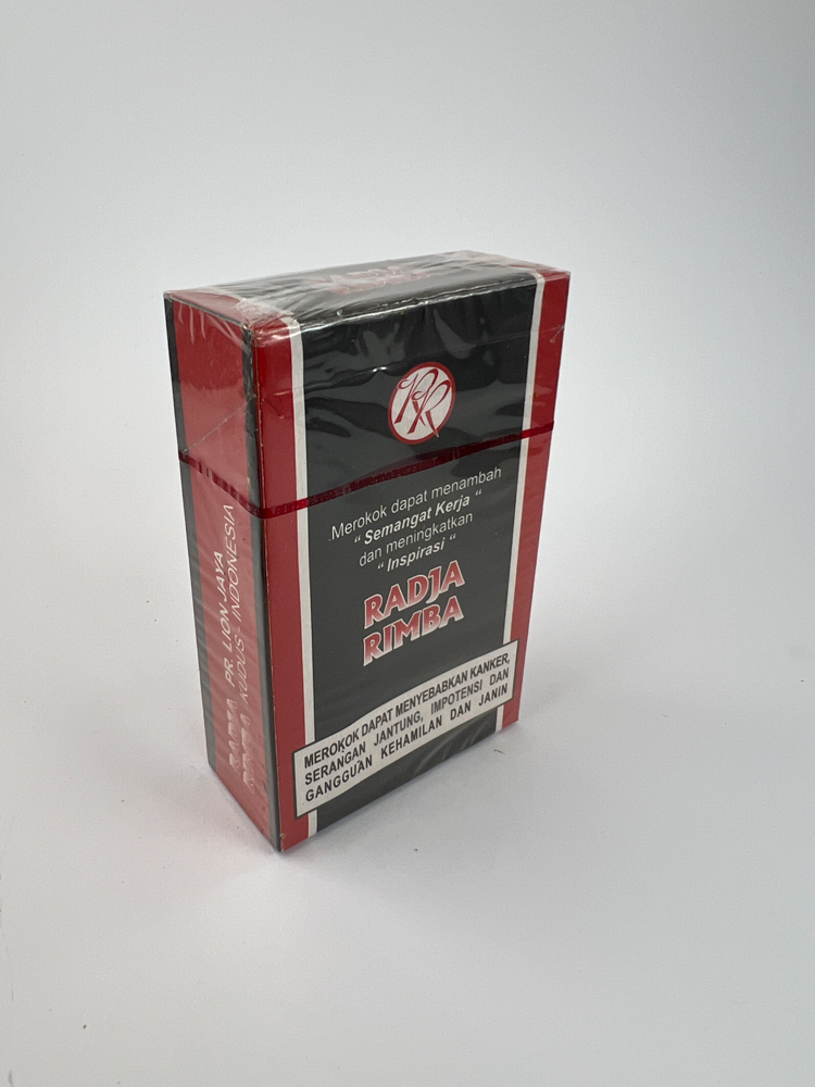 Description: Radja Rimba is an Indonesian kretek (clove) cigarette with a contrasting black and red design. The front side features a heraldic lion and the inscription "Lion Jaya", indicating the manufacturer. The back side features an advertising slogan in Indonesian and the usual health warning about the dangers of smoking. This release is intended for the local market, and the quantity of 21 cigarettes is typical of Indonesian manufacturers' practice.