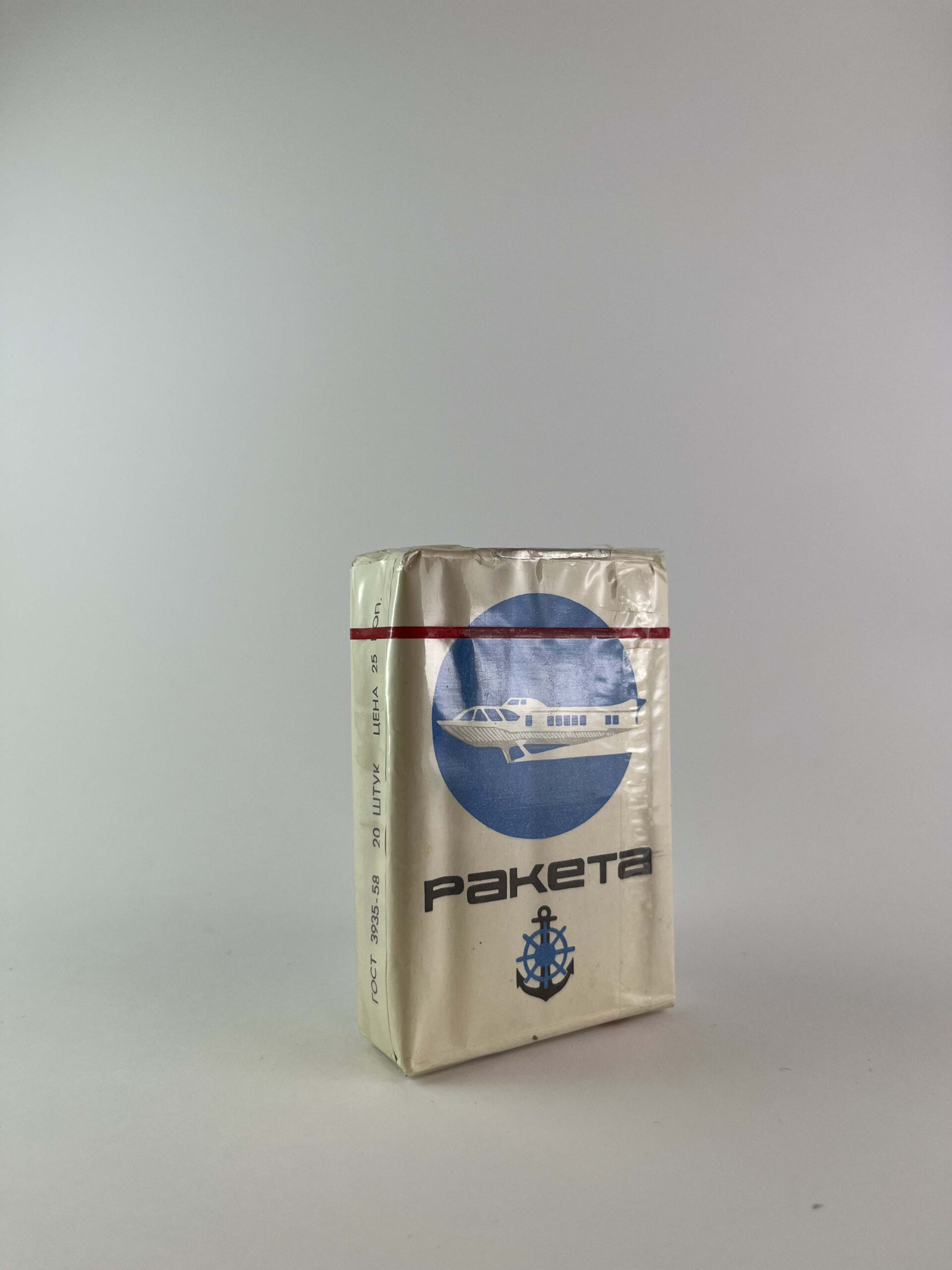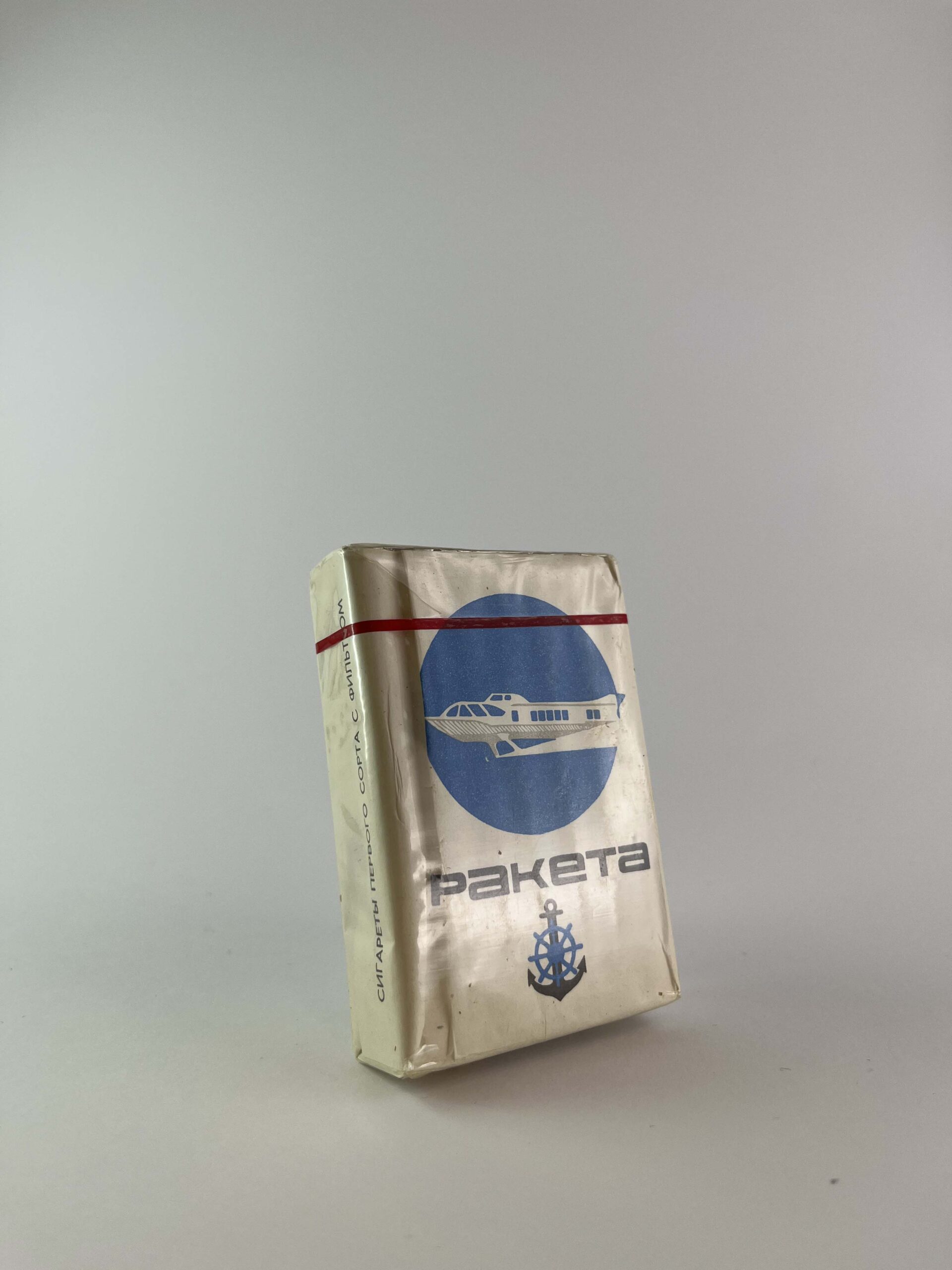 Aprašymas: Raketa cigarečių pakelis suprojektuotas minimalistiniu ir moderniu dizainu, pabrėžiant greičio ir inovacijų idėją. Ant pakuotės pavaizduotas laivas „Raketa”, kuris asocijuojasi su transporto pažanga ir sovietiniu inžineriniu pasididžiavimu. Pakuotė dekoruota balta, mėlyna ir raudona spalvomis, kurios dažnai simbolizuoja Sovietų Sąjungos nacionalinius atspalvius.