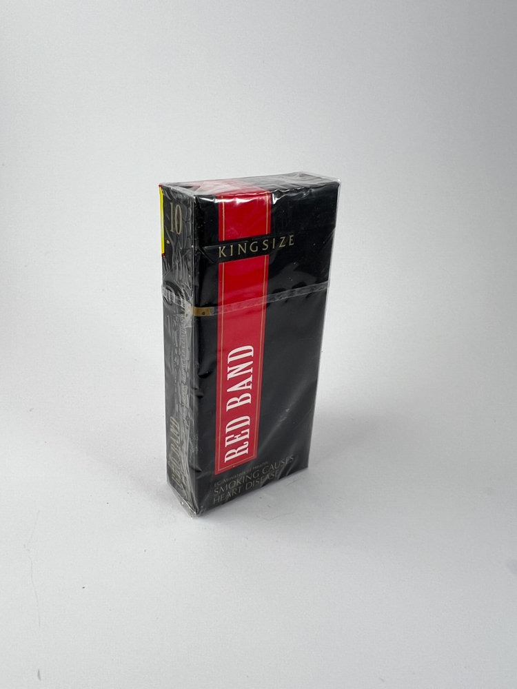 Description: Black package with a vertical red stripe in the center and logo RED BAND. Top – „KINGSIZE“, front bottom text health warnings („SMOKING CAUSES HEART DISEASE“ / „TOBACCO SERIOUSLY DAMAGES HEALTH“). Top – yellow price sticker „£1.39“. Left side – number „10“, barcode, informational text. Condition – unopened, with cellophane.