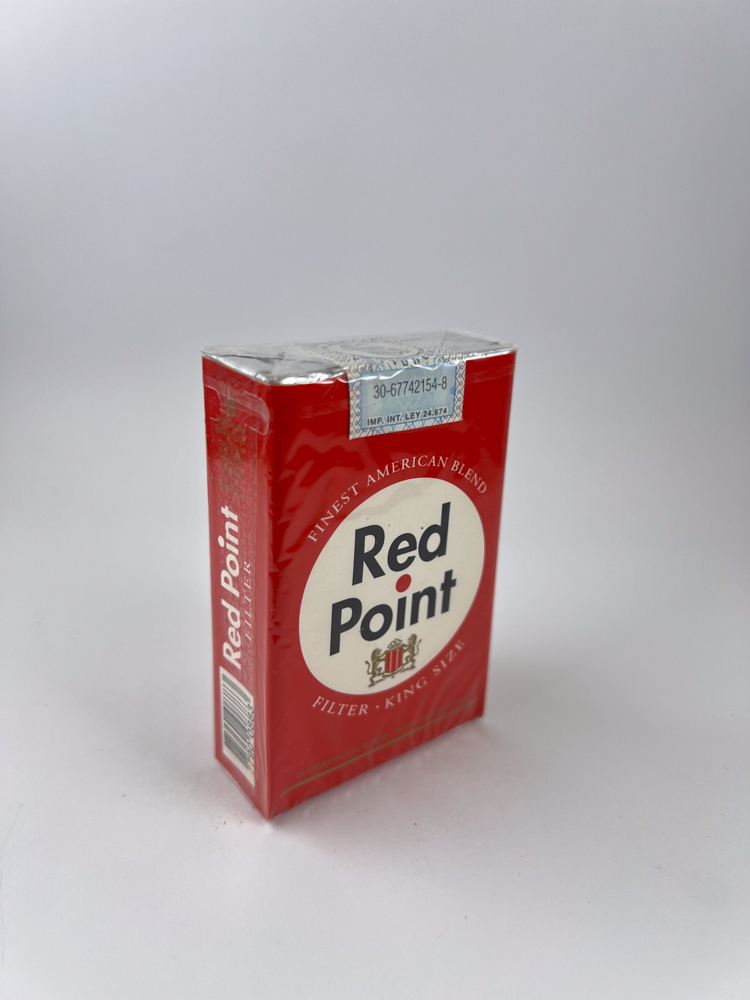 This Red Point cigarette pack made in Argentina with a classic red and white design combination. On the front side – a white oval with the inscription “Red Point”, under it – the coat of arms, and below – the marking “FILTER KING SIZE”. Above on a red background – the slogan “Finest American Blend”, emphasizing the American-style tobacco blend popular in South America in the 1980s and 1990s.