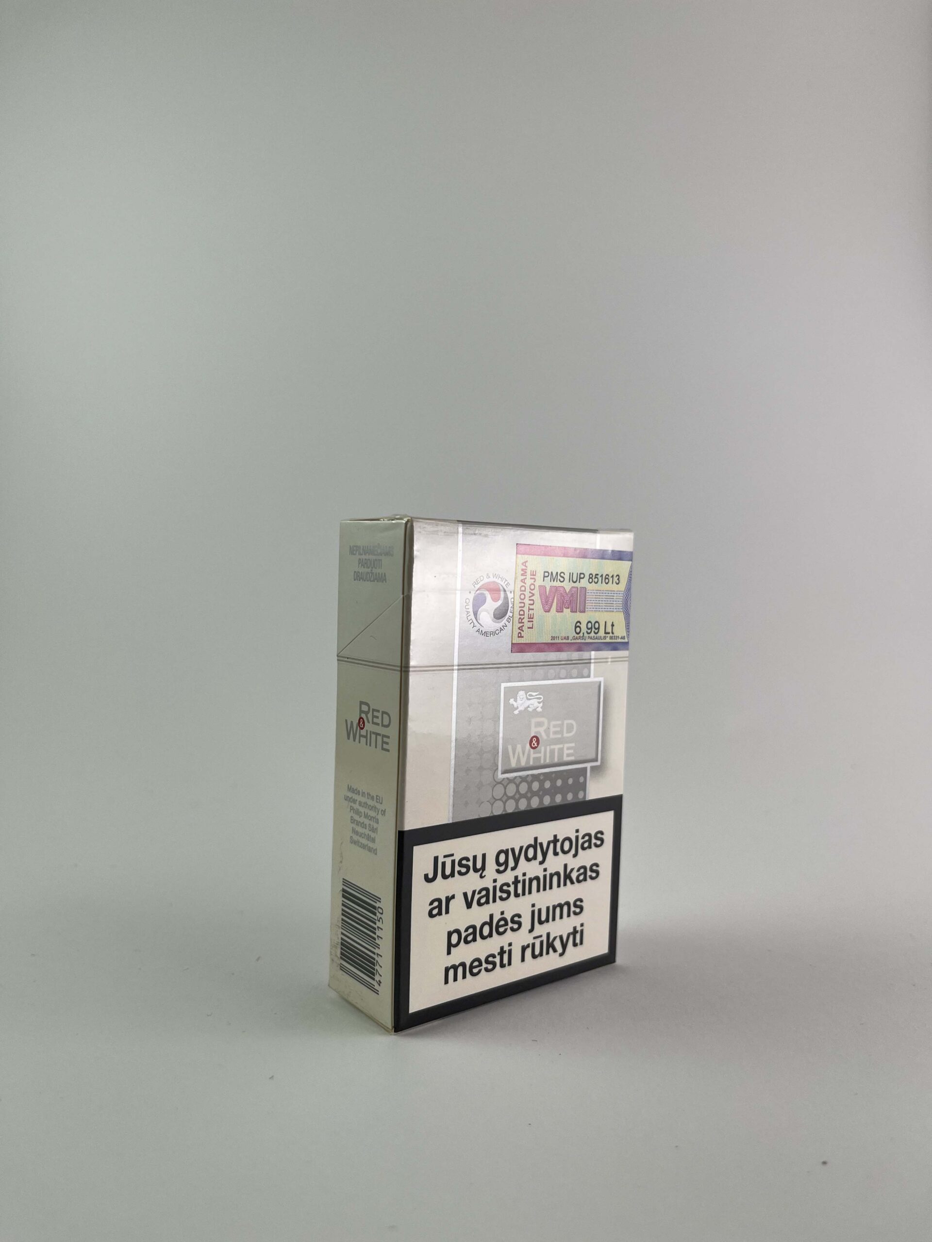 Šis Red & White Fine cigarečių pakelis pasižymi minimalistiniu, sidabriniu ir balto dizaino deriniu su ryškiais prekės ženklo elementais. Šalia yra matomas sveikatos įspėjimas, kuris buvo įprastas ES šiuo laikotarpiu. Prekės ženklas aiškiai matomas, o „Fine“ linija paprastai orientuota į švelnesnį skonį ir lengvesnį dūmą, skirtą rinkai, kurioje pirkėjai ieško subtilios tabako patirties.