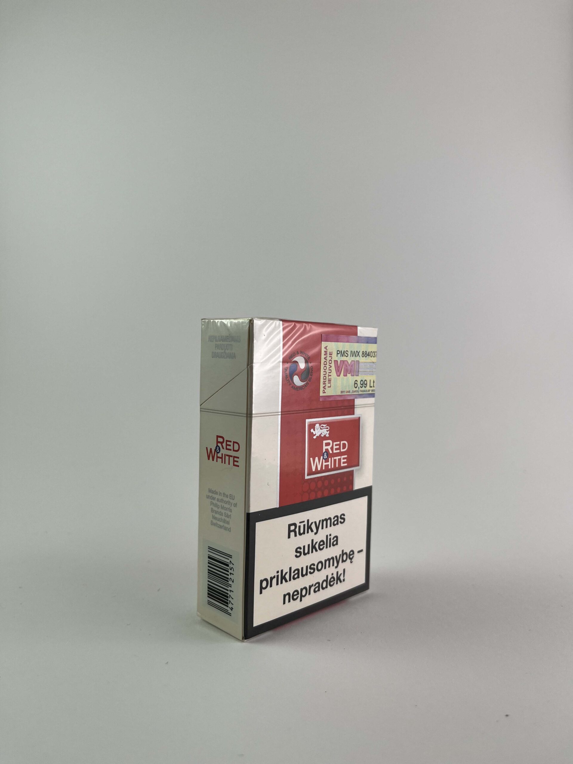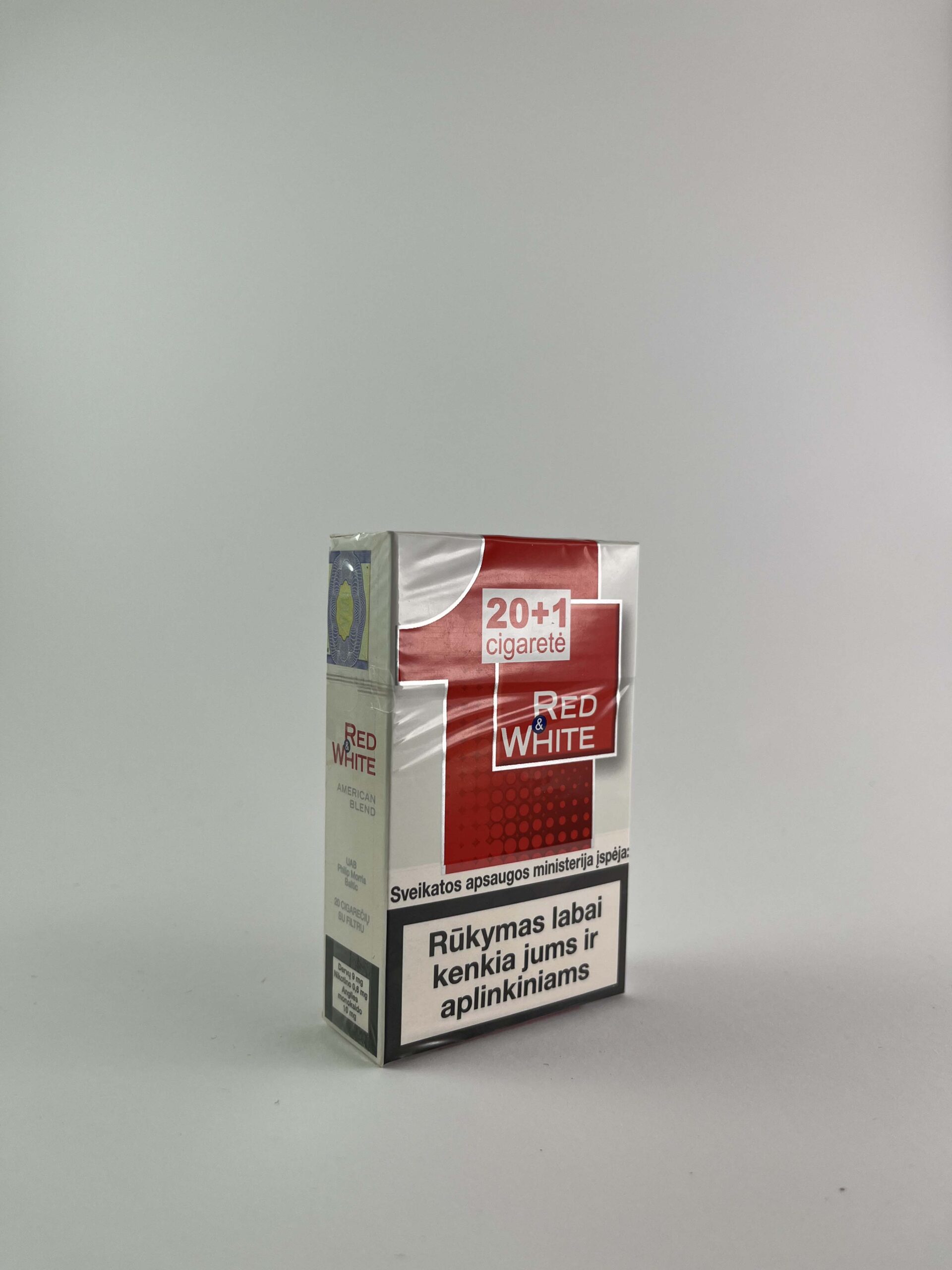 Description: This pack of Red & White American Blend cigarettes features a unique packaging feature – an extra cigarette marked „20+1“. The pack design is subtle with a red and white colour palette, with accents that reflect the brand name. The pack also features a health warning highlighting the harms of smoking, which has become standard in the EU during this period. Value assessment: