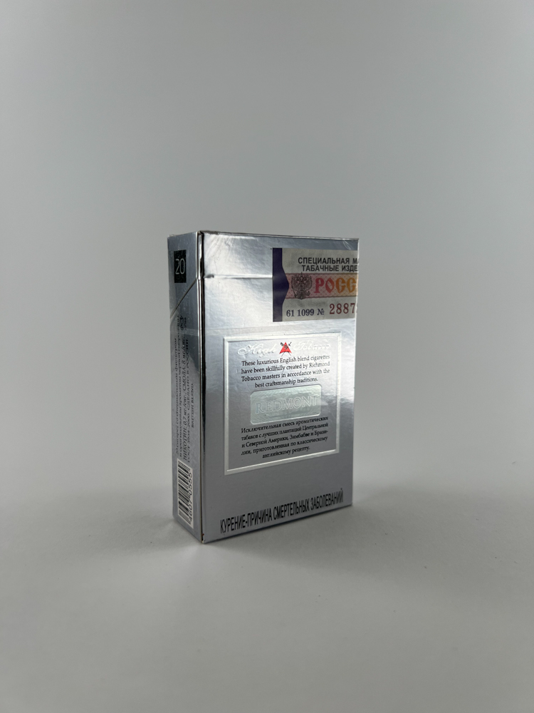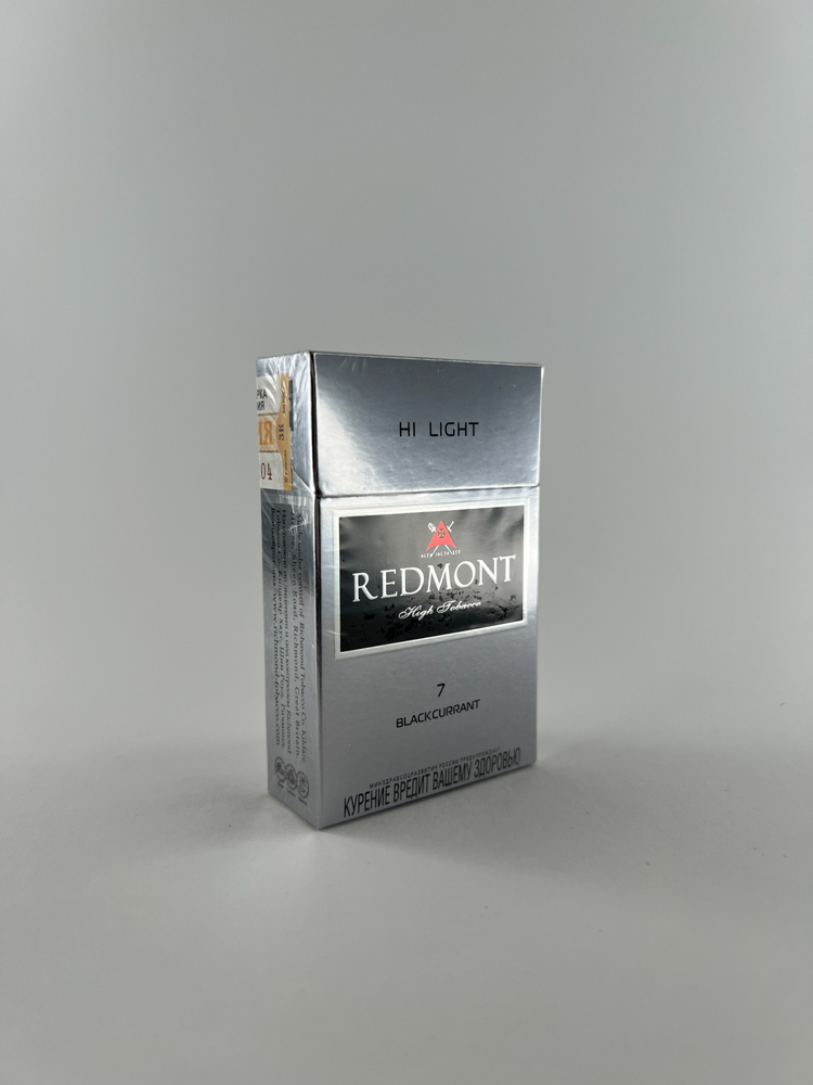 „Redmont is a cigarette brand that aims to create a luxury image. This version is flavored with Blackcurrant, which has been a popular niche among smokers looking for unconventional flavors. The pack retains a minimalist, metallic design with bright typographic accents and the inscriptions "High Tobacco" and "Hi Light". On the back is a luxurious description of English tobacco blends, which should convey an image of Western origin, although it is a local product. At the top is the original Russian excise stamp.