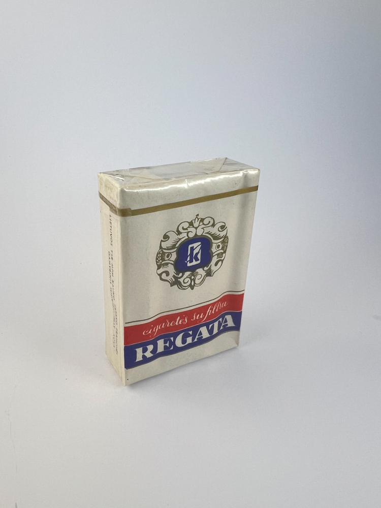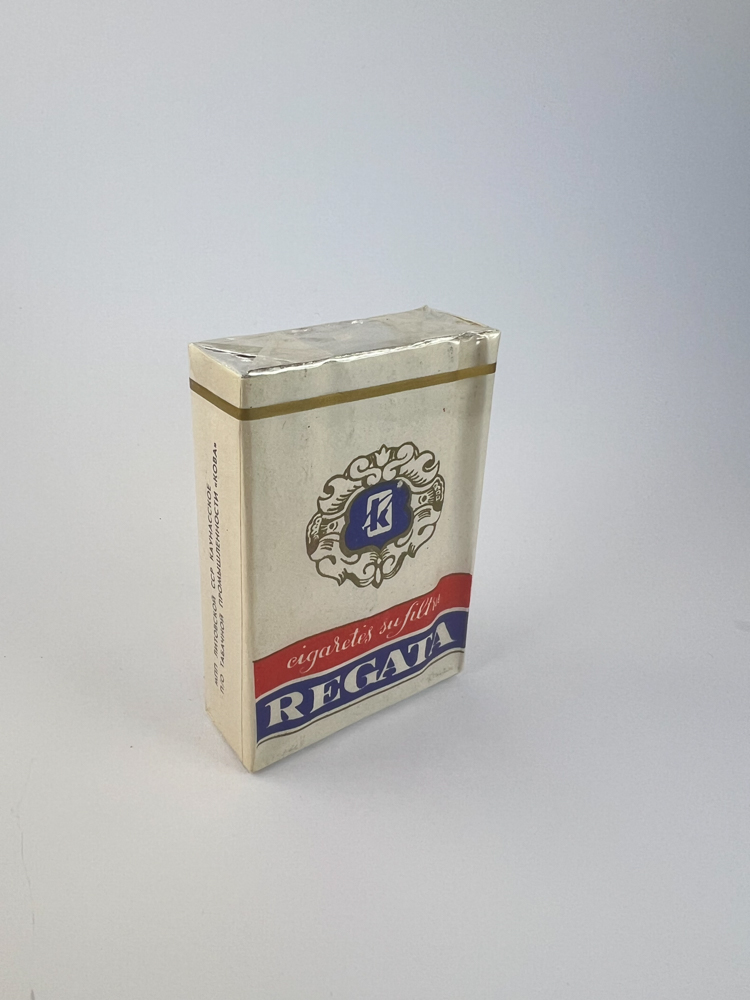 Description: „Regata“ cigarečių pakelis – tai vienas iš gerai atpažįstamų lietuviškų TSRS laikotarpio produktų. Šviesi pakuotė su klasikiniu herbu ir mėlynai raudonomis juostomis perteikia vakarietišką stilių, tuo metu būdingą aukštesnės klasės vietiniams leidimams. Ant pakelio užrašyta „cigaretės su filtru“, o šoninėse pusėse pateikta informacija lietuvių ir rusų kalbomis. Centre esantis „K“ inicialas tikėtina nurodo gamintoją – Kauno tabako fabriką, tuo metu veikusį TSRS sudėtyje. Pakelis išlikęs autentiškas ir tvarkingas, su vis dar nepažeista apsaugine plėvele.