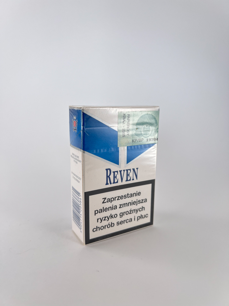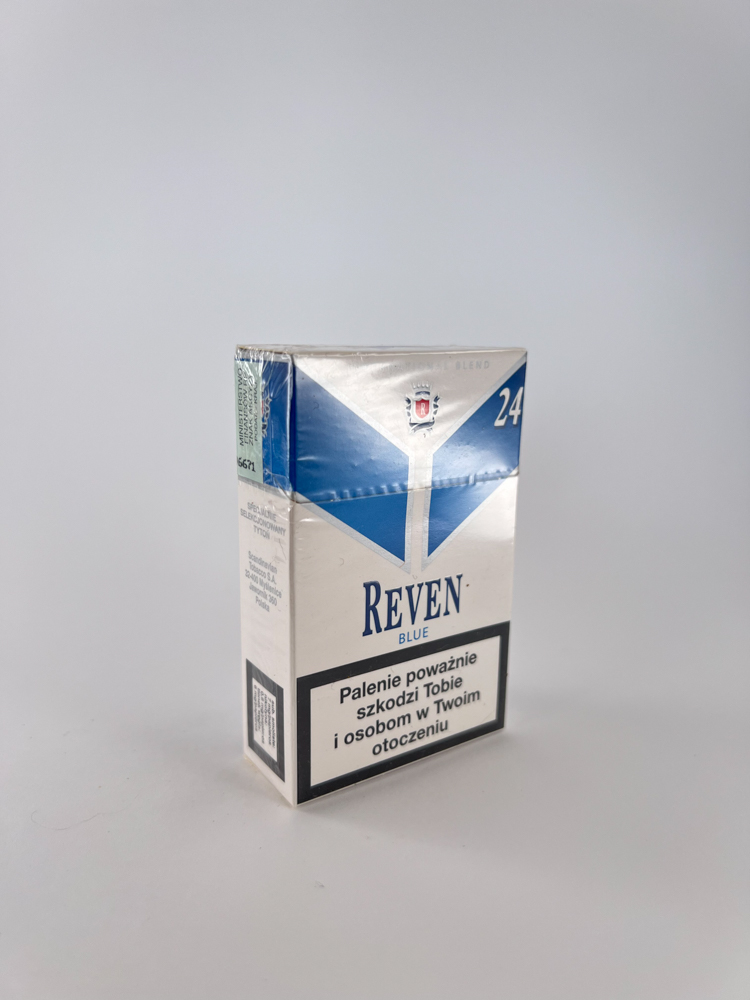 This pack of Reven Blue cigarettes is a rather rare product on the Polish market. It features a diagonally divided blue and white design, a stylized coat of arms in the center and the inscription "Reven Blue". It is a hard pack, released in 2005. with warnings in Polish. A distinctive feature is 24 cigarettes, when most packs contain 20, so this format may be an additional factor in collector value. On the sides it is indicated that the manufacturer is Zakłady Tytoniowe w Lublinie SA., one of the historically important Polish tobacco producers.