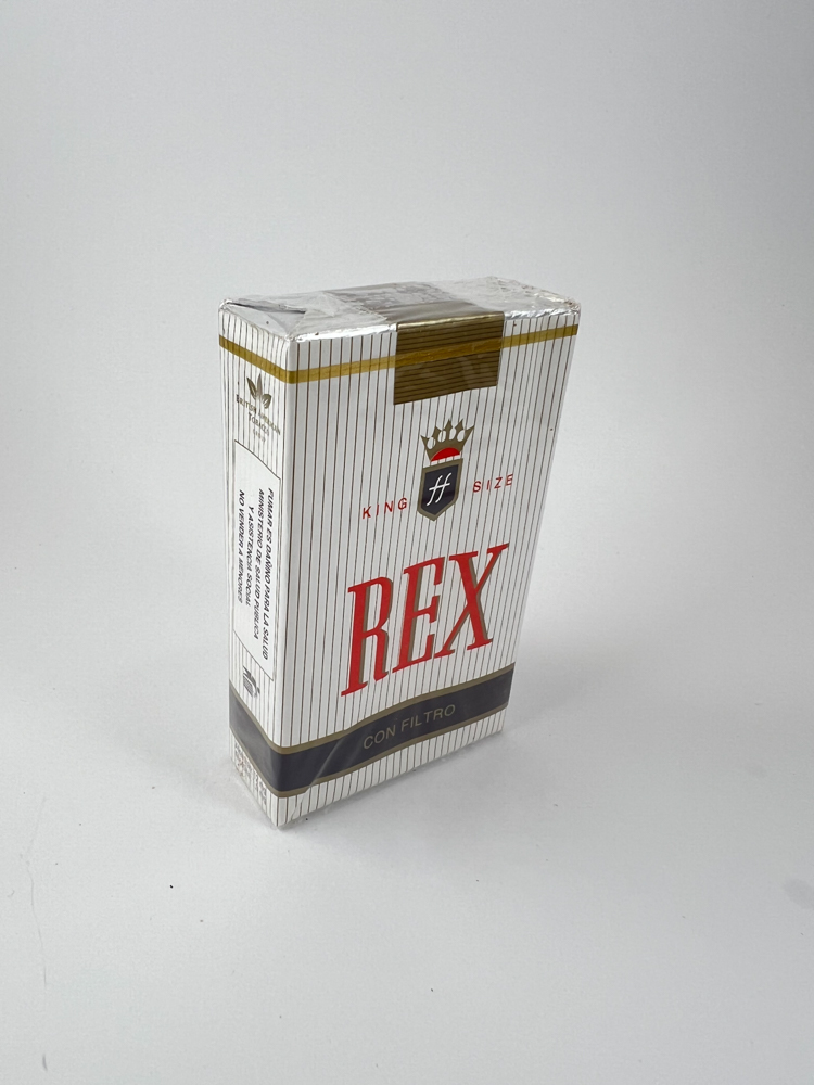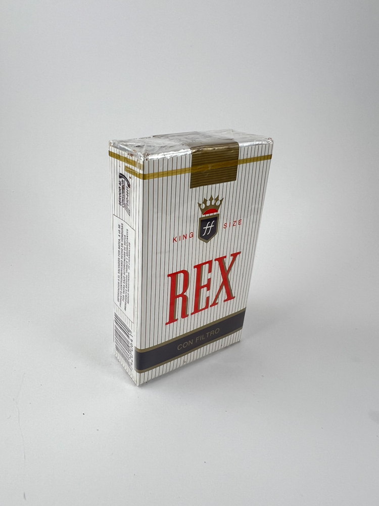 This REX cigarette pack features classic European design. Thin vertical grey lines are arranged on a white background, and the brand name „REX“ is printed in bright red letters in the center. Above the name, a coat of arms with a crown and the initials „ff“ is visible, under which „King Size“ is marked. At the bottom, on a dark grey background, „Con Filtro“ is written. The pack has a gold accent at the top, and the entire structure is rigid, covered with film. The design is subtle, in keeping with the aesthetics of Italian cigarettes of the period – clean, refined, without excessive graphic elements.