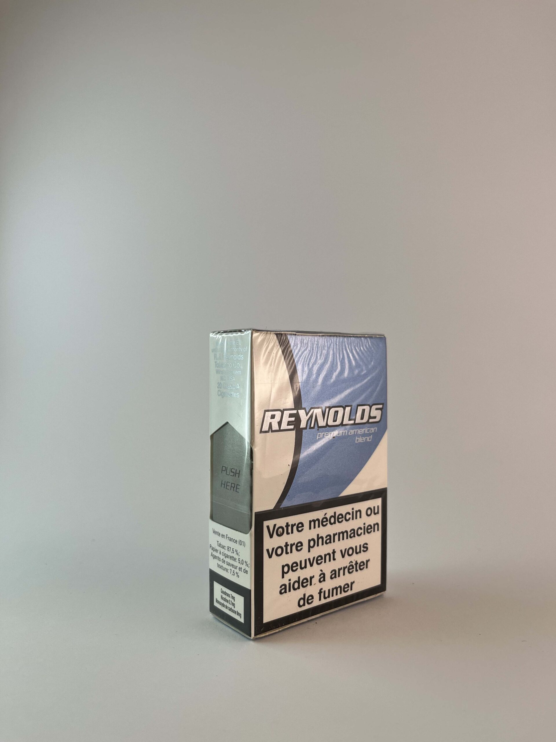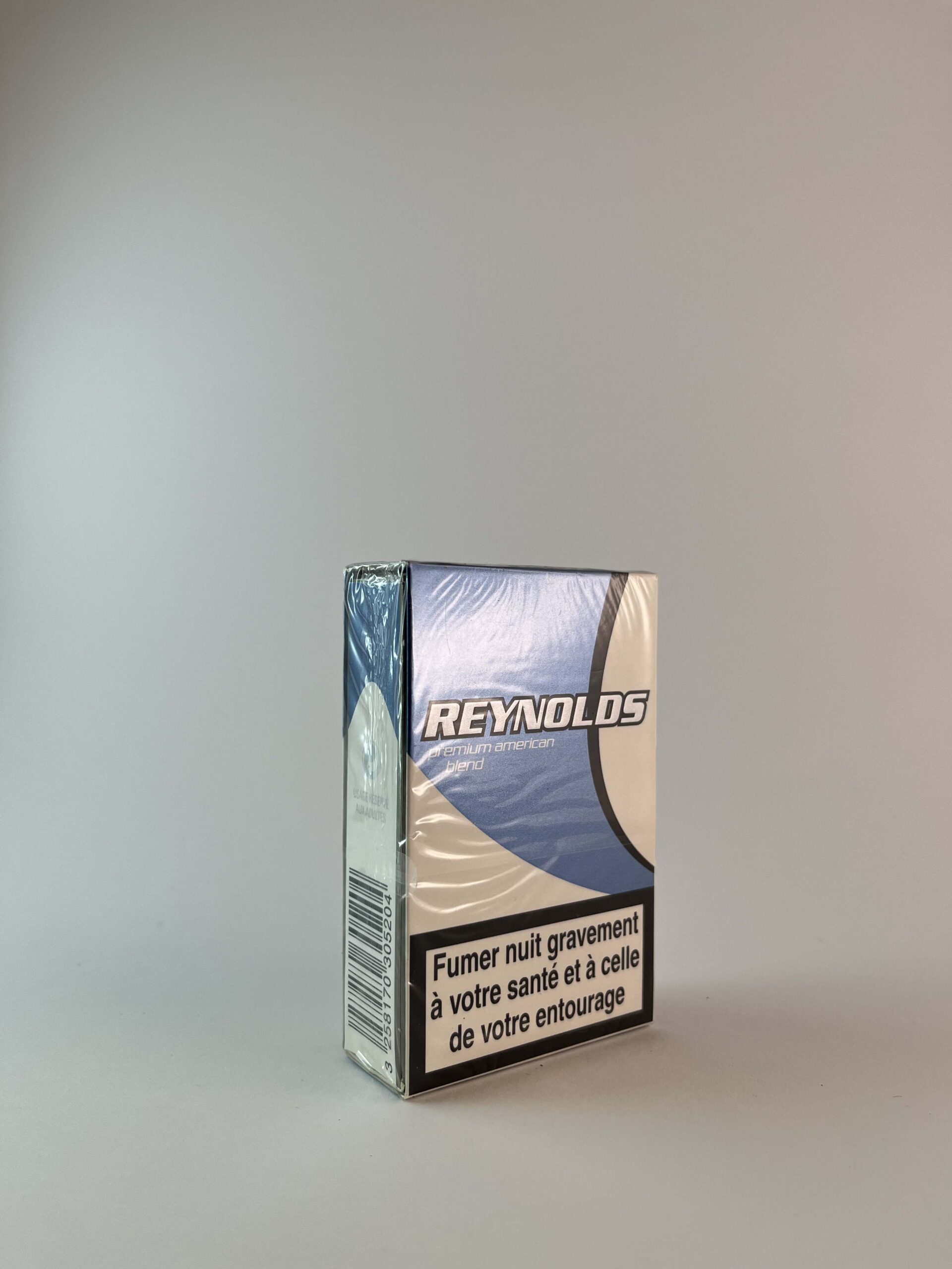Description: Reynolds Premium American Blend cigarette packs feature an elegant design, featuring a modern blue color scheme and a bold logo. This pack conveys a sense of luxury and is aimed at smokers who appreciate the taste of American tobacco. The pack features a large warning in French about the dangers of smoking, highlighting the health risks.