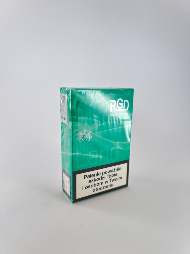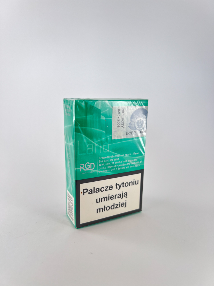 Description: The RGD „Land“ series menthol cigarette pack stands out with its bright greenish-blue color and the slogan „created by nature“. The design conveys an impression of naturalness, and the description on the back of the pack emphasizes the concept inspired by the elements of nature – „flame, sea, land and wind“. It is obvious that this was a segment focused on menthol lovers with a „fresh taste“ image. The import mark „PAPIEROSY IMP. – 2008“ is clearly indicated on the back, which indicates that the cigarettes were imported to Poland.