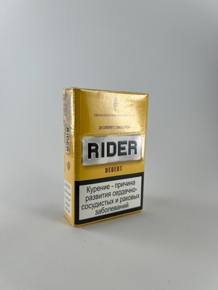 RIDER „Desert” is a mid-range cigarette pack featuring a gold background, a raised metallic „RIDER“ logo and a minimalist design. The name „Desert“ is often associated with a milder-tasting tobacco intended for markets where a light, „dry“ smoke is appreciated. The warnings written in Russian indicate that this release was intended for the countries of the former Soviet Union – most likely the Russian, Belarusian or Kazakh markets. The pack has an original excise sticker with the „МИНФИН“ sign.