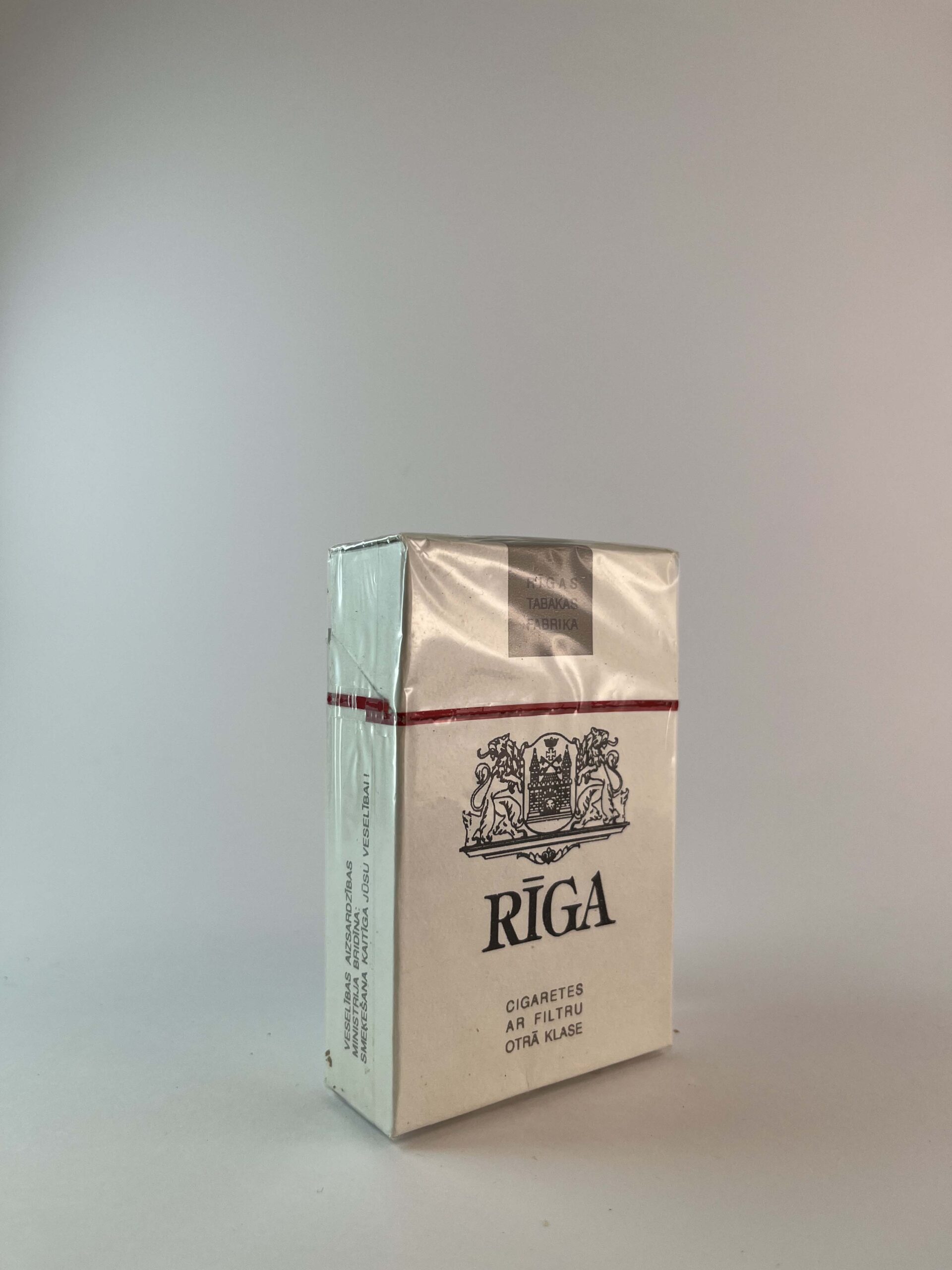 Description: The Rīga cigarette pack is modest and elegant, with a white background and a black symbol of the city's coat of arms. The package features the inscription "Rīga" with the words "Cigaretes ar filtru, otrā klase", which indicates that these cigarettes are with a filter and belong to the second class. The design is minimalist, but represents the theme of the city of Riga, which gives the pack a local uniqueness. The package also contains a warning about the health hazards of smoking in Latvian.